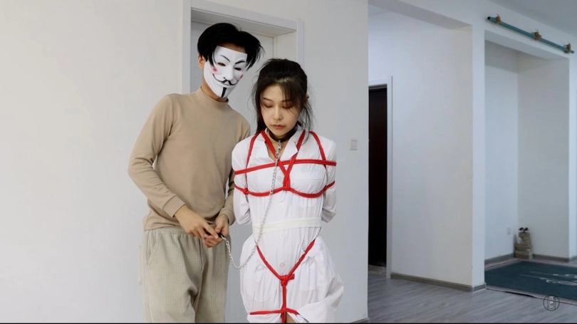 双手攥拳被胶带裹住,双手反剪后被红绳绑在身后,双腿也被并拢绑在一起,一步一步的束缚让米娅体验到了逐渐丧失活动能力的无助感,同时自己还需要配合捆绑,更加令她感到羞耻。