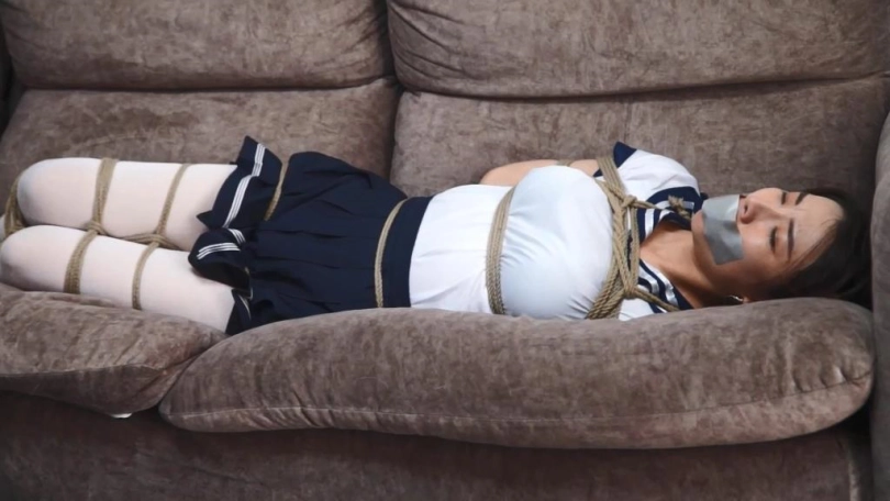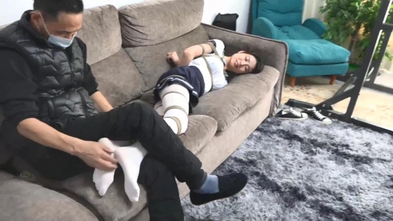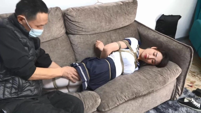 (小明用丝袜塞住珊珊的嘴巴,并用银色胶带粘住)