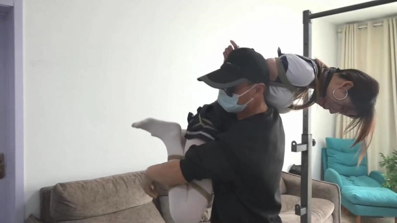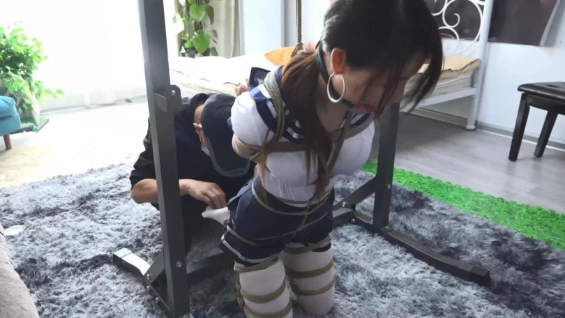 3.丝袜堵嘴的时候要将丝袜完全塞进模特嘴里,不要露出部分在嘴巴外面。