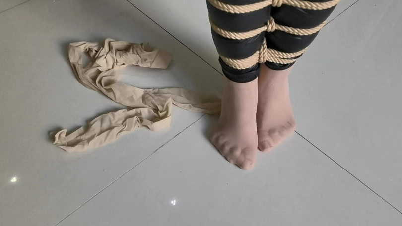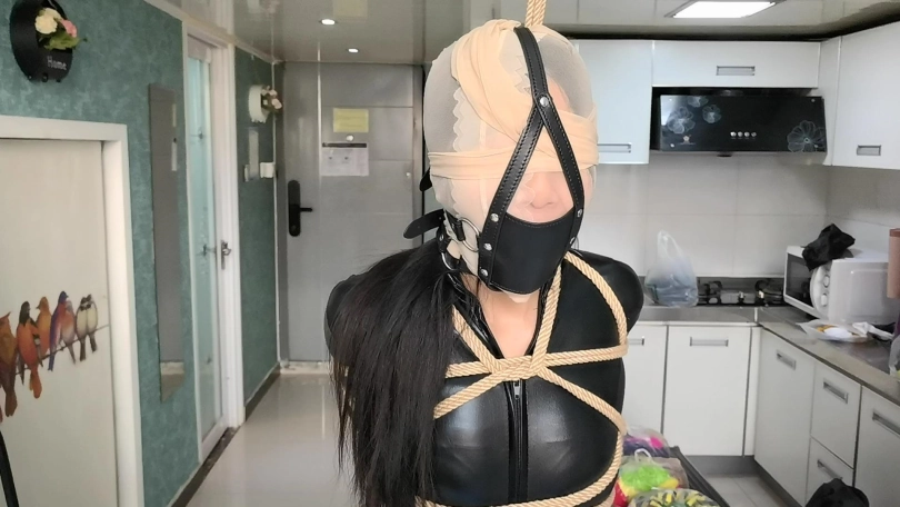 她穿者黑丝涂胶衣,全很被绳子紧紧的捆绑起来,并悬吊固定。这让她不得不踮起脚来减轻自身重量。用一条连裤袜套在她的头上,并蒙住眼睛。用马具性口塞堵住她的嘴巴。在她的阴D处固定快乐棒,不断的刺激着她并用皮鞭抽打她。。。