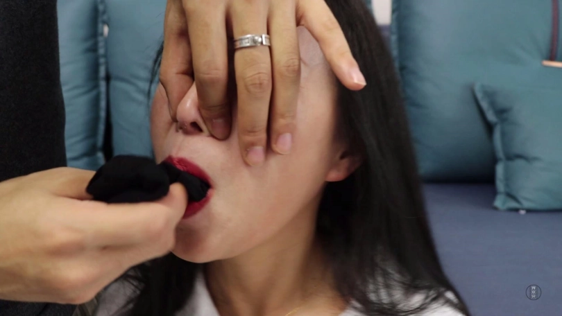 为了惩罚文清之前想跑,劫匪扒掉文清脚上穿的一双肉色短丝袜,拽出文清口中黑色短丝袜丢掉后捏住文清鼻子强行把这两只原味肉色短丝袜塞到文清口中,并拿黑色宽胶布剪下5张封在文清嘴外,用黄色胶带缠绕多圈,最后用肤色弹力自粘绷带缠绕多圈封严实。