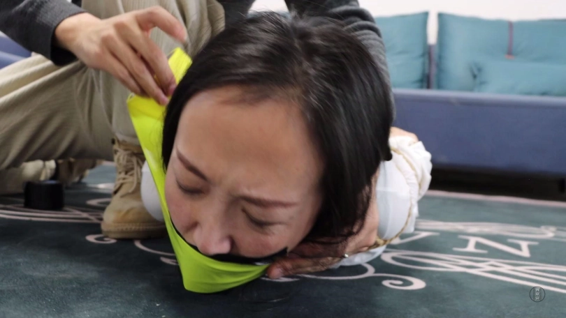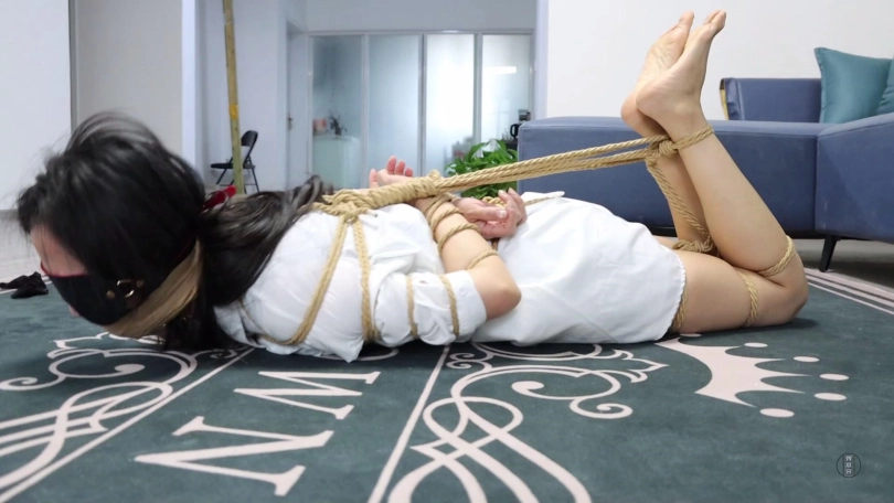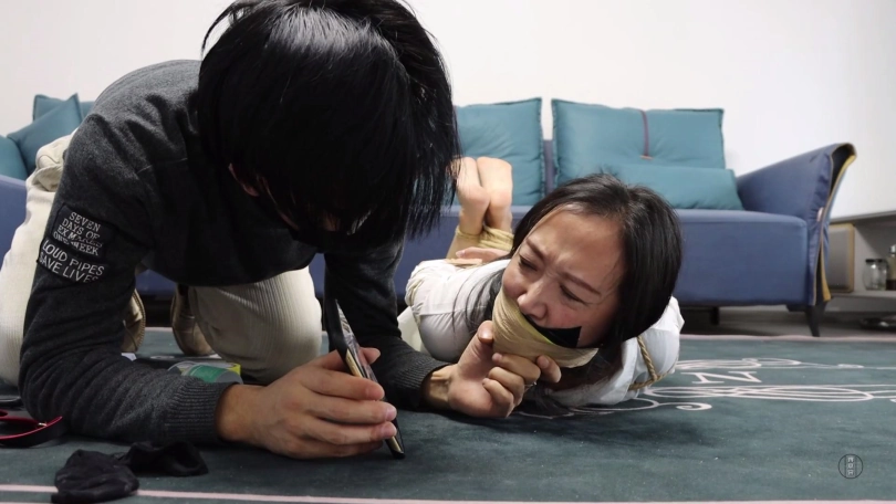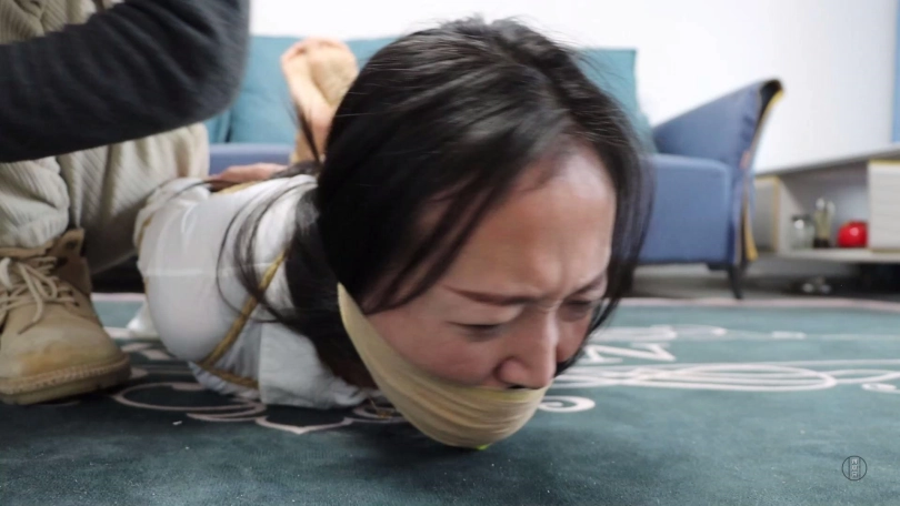 劫匪将文清上身五花大绑,双腿脚踝重新并拢捆绑好,并在此基础上捆成驷马姿势放置在沙发前地上。