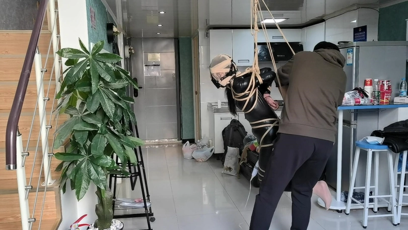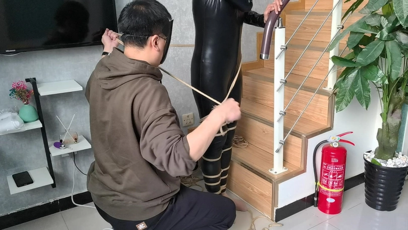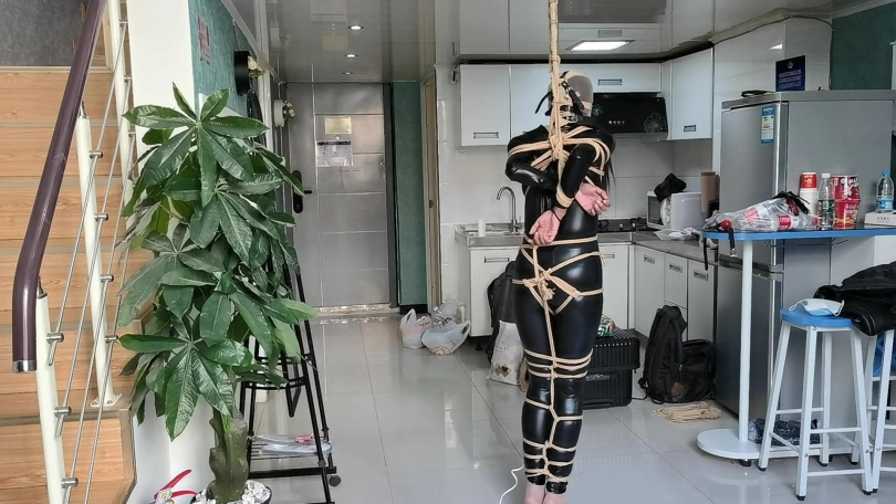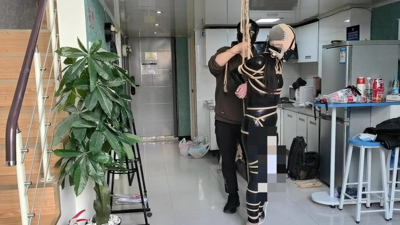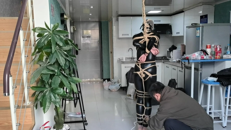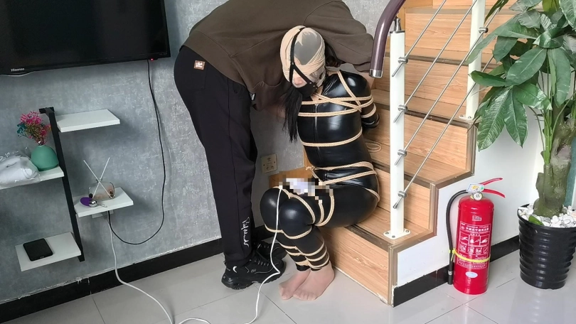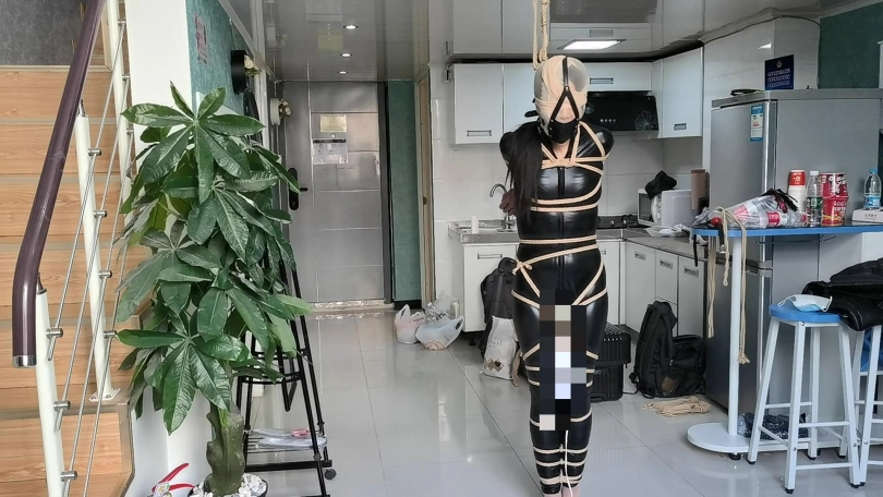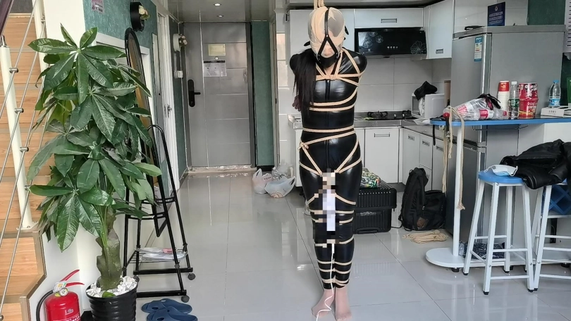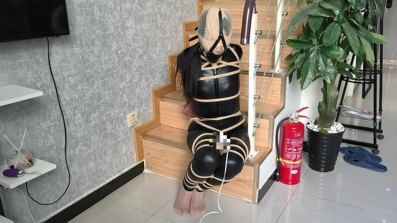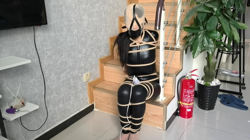 【JS】【小安】黑胶衣全身紧缚吊垫脚尖丝袜套头马具性口塞快乐棒刺激GC