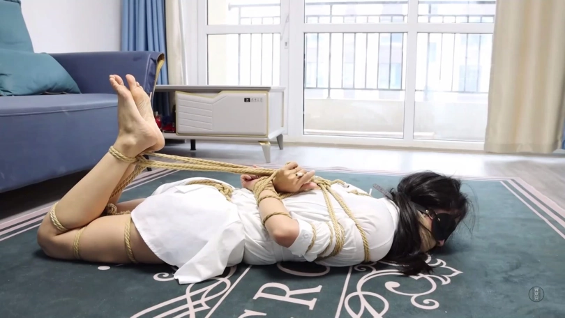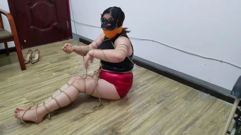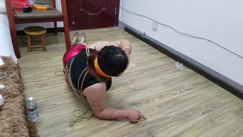 (二)被男女S报复折磨驷马捆堵的胖女M经过努力弄松绳结挣脱开,一点点撕掉嘴外自粘绷带和宽胶布,拽出口中四只短丝袜大口喘气,而后逃脱。
