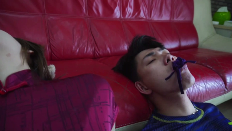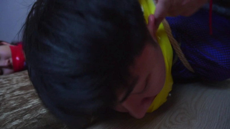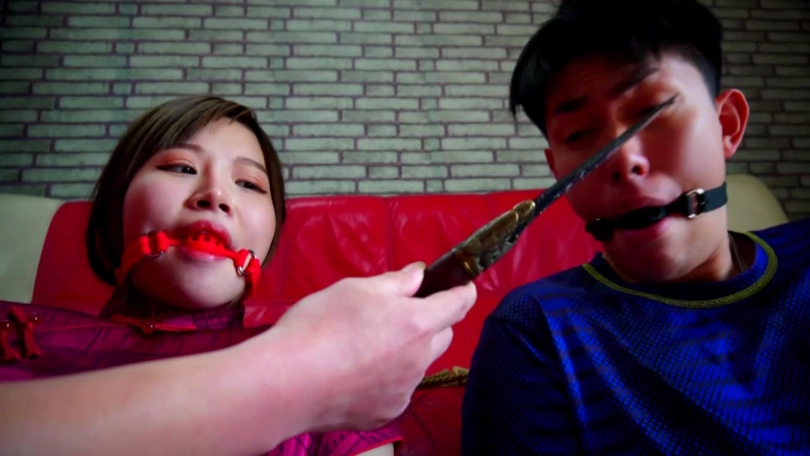 情侣二人在家被歹人打劫捆绑,劫匪分别拿两条内裤塞入二人口中,好在二人捆绳较少,一番互助解绳后挣脱束缚,但是想跑时被劫匪发现。