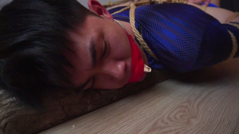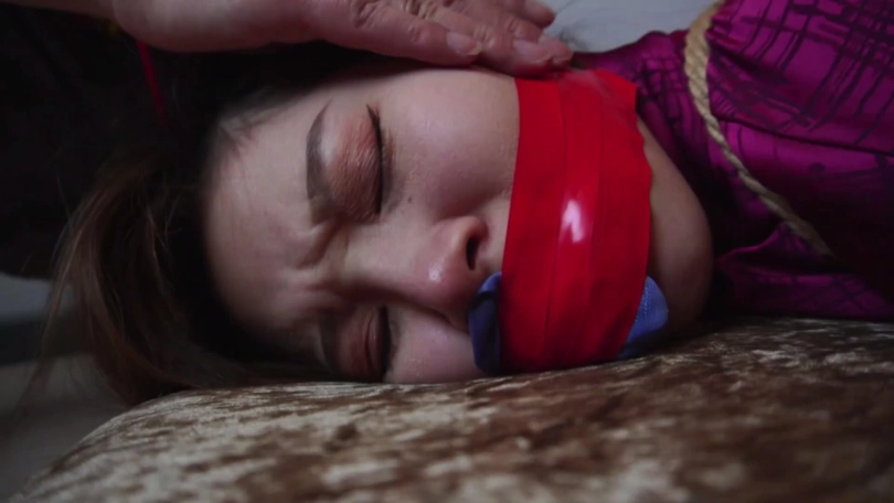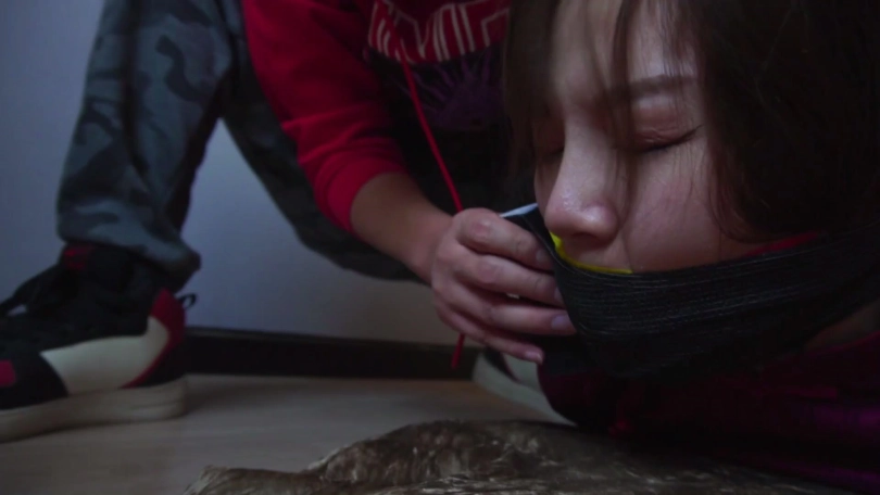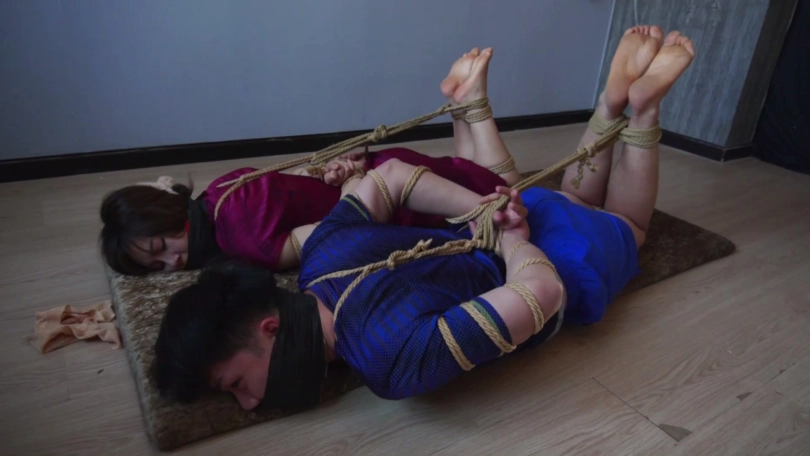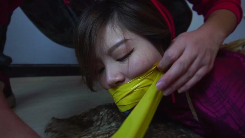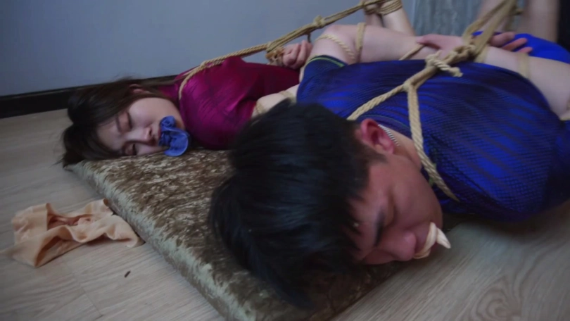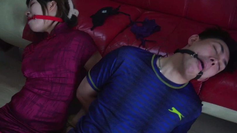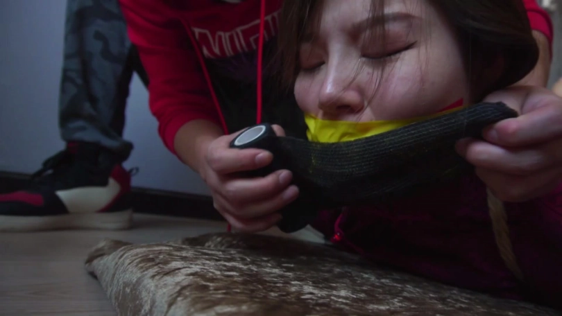 劫匪将男女情侣二人上身五花大绑,双腿脚踝并拢捆绑多道,并在此基础上将二人驷马捆绑放置,分别扒掉二人脚上穿的一双肉色锦纶丝袜和深蓝色锦纶丝袜交换塞入二人口中,令情侣二人苦不堪言,接着,劫匪用红色胶带、黄色胶带、黑色自粘绷带缠绕封嘴,令情侣二人只能发出微弱沉闷的呜呜声。