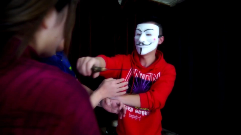 劫匪给二人拍了几张照片,还故意拿给他们看加以羞辱,愤怒的情侣二人瞪向劫匪,劫匪遂用黄色胶带和黑色自粘绷带缠绕封眼,为了报复女模特小琛还恶作剧般去挠她的脚面,令她不断愤怒地发出呜呜呜闷哼声。