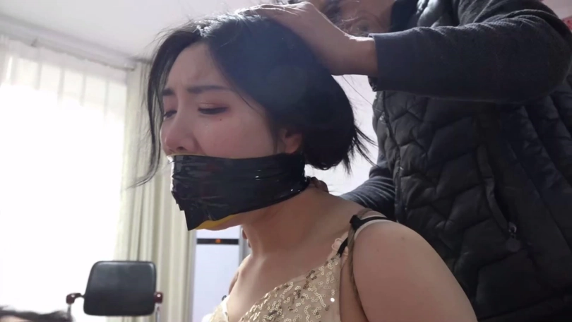 随后柳洋锁哥用黄色宽胶布分别剪下5张封在二女嘴外,用黑色胶带和紫色弹力自粘绷带分别在二女嘴外缠绕5圈,将他们嘴封得严严实实。