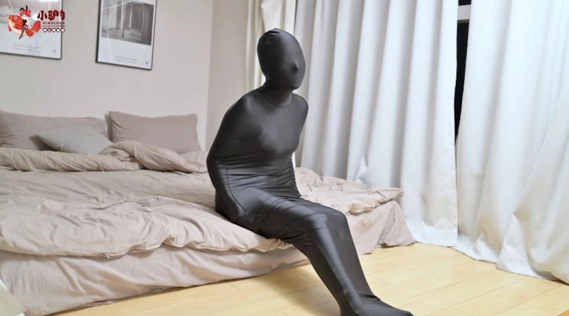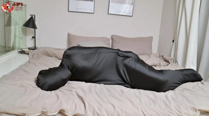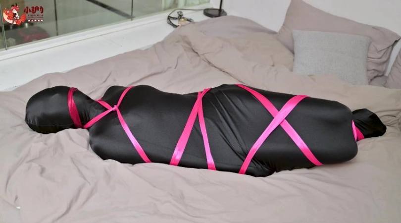 穿着肉色裤袜制成的Zentai的女M用黑色睡袋进行自缚挣扎,后被红色丝带捆住。