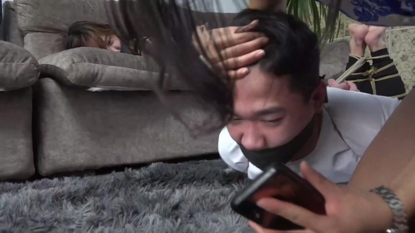 梁静回家发现男友被捆堵欲给其解开,反被夏炎迷晕控制捆堵,嘴巴被男友脚上脱掉的另一只臭锦纶丝袜塞住。