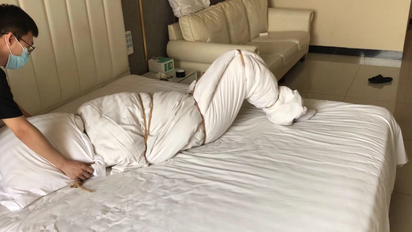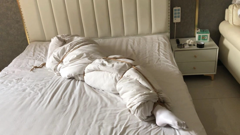 3、棉被闷热包裹,挠脚心挣扎。小周力气小,扛不住棉被的厚重。