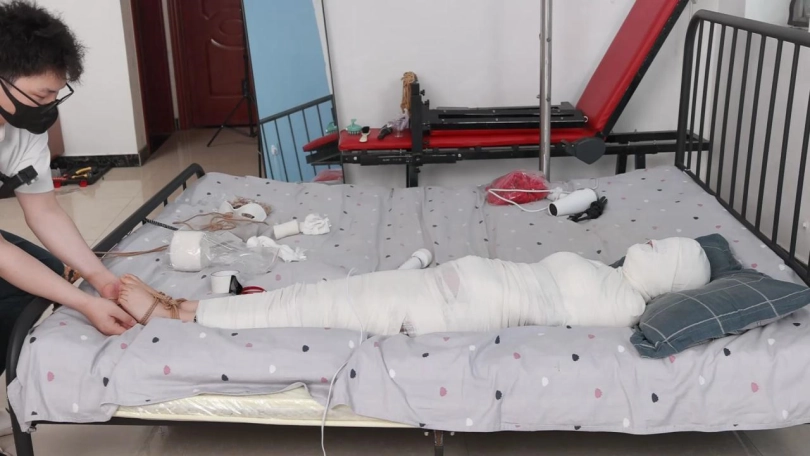 【心悦艺束】外卖惊魂(下)—承接上部,被老板调教拘束的女孩好不容易找到机会逃跑,却被反锁的单门拦下,这下老板可是气坏了,把女孩全身上下都用胶带和绷带层层缠绕,彻底杜绝女孩逃跑的可能,而且还要好好惩罚她