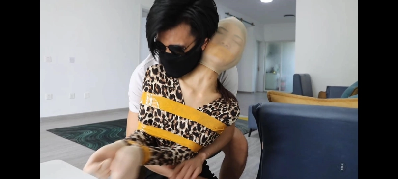 身穿豹纹连衣裙的女人在卧室休息,突然一蒙面男子持枪闯了进来并控制住了她。男子用胶带简单将她绑了起来,封住嘴巴,套上头套。然后就睡着了,女人趁男子睡着之时,偷偷溜出卧室,去客厅试图用手机求救,但是因为被套上了头套,无法面部解锁,无奈之下只好放弃。开始四处寻找能割开胶带的工具,找了好久,终于找到了一把小刀,正准备割开胶带的时候,突然一把枪就抵住了她的后脑勺。女人就这样被拖进了屋子里,男子为了防止她再逃跑,将她用胶带结结实实得绑了起来,最后,搜刮完财物的男子并没有选择放了她,而是把她放进了柜子里,关上柜门后,又将柜子的缝隙用胶带封死。伴随着女人绝望的叫声。。。。。。
