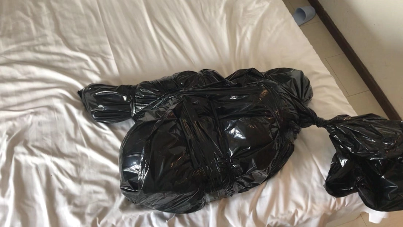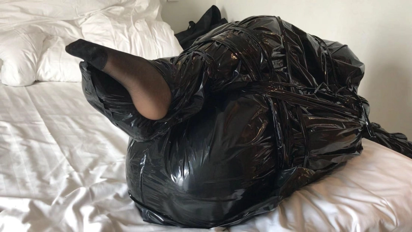 2、黑塑料袋装,露出一只黑丝脚。