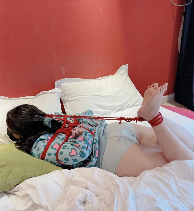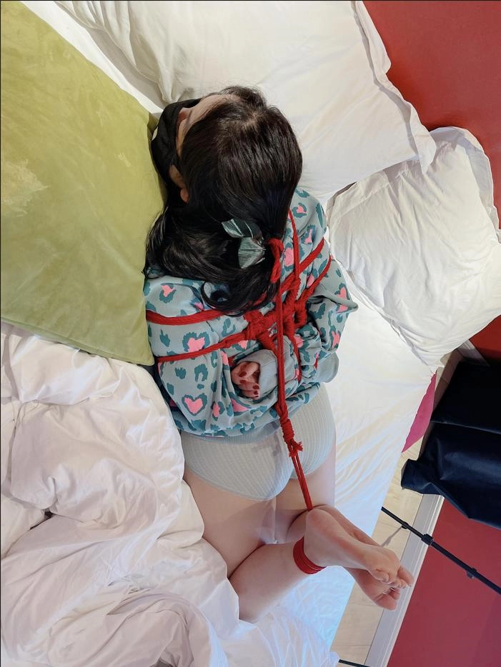 把妹子驷马绑好,不同的是这次把头发扎起来和脚腕绑在一起。学妹可怜的小脑瓜被迫向上抬起,只要稍微动一动就会拉扯到头发和脚腕~