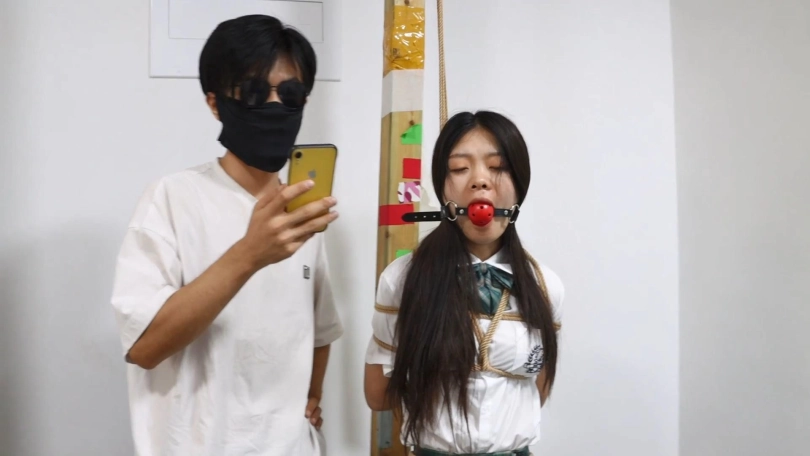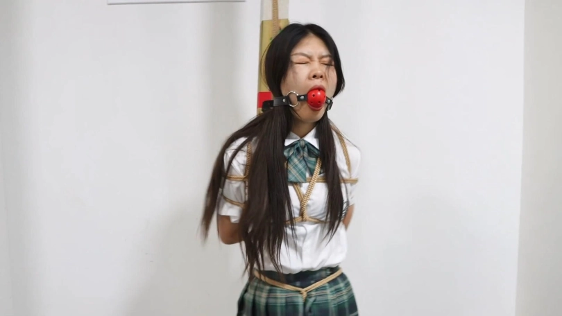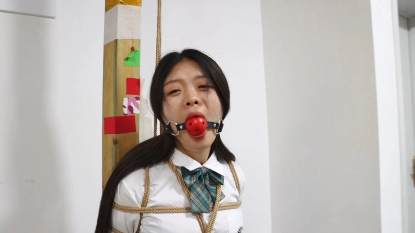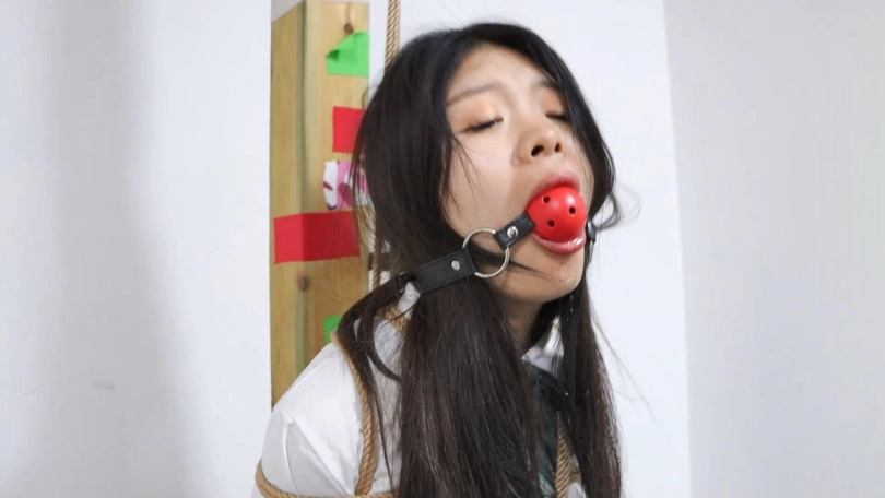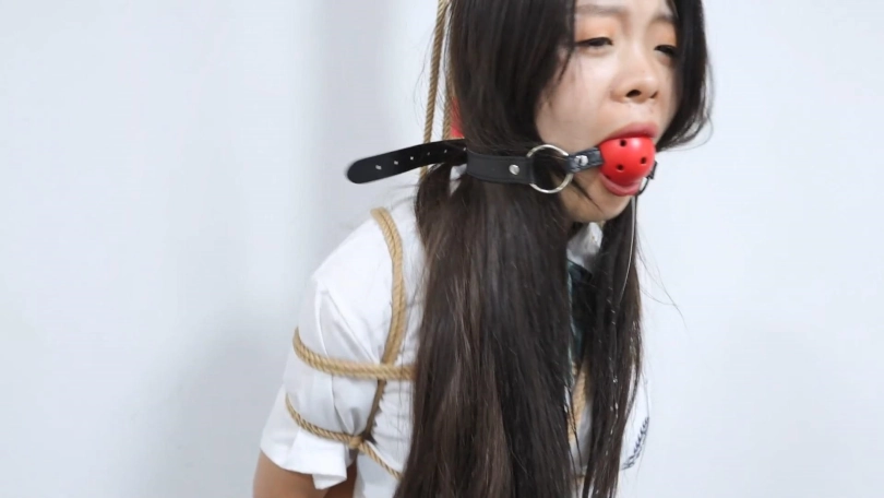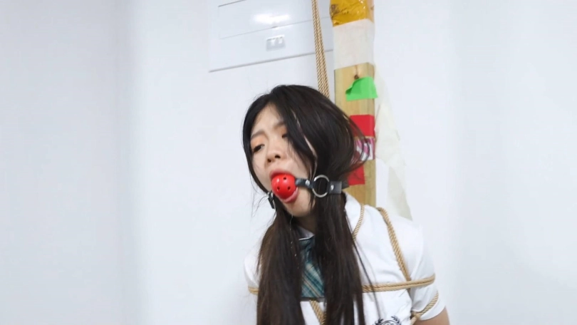 老板给秘书菲儿带来了一套JK制服,跟她玩一个小游戏。在办公室里菲儿被日式后高手直立吊起来,站在5本书上。老板说:这里有8道题,你要是答对了没有奖励,答错一题抽一本书,这些题都是中学课本上有的,今天来给你找找学生时代的感觉。然后老板给菲儿带上一个大口球,菲儿说你给我带口球我怎么答题。老板说:怎么带上口球就发不出声音了吗,刚才不是叫的挺欢的。然后开始答题,菲儿正好答错了5道题,老板把书全都抽走了,菲儿最后只能踮着脚被吊在办公室里。老板说一看就在学校没有好好学习,就留你在这里罚站好好反省吧。