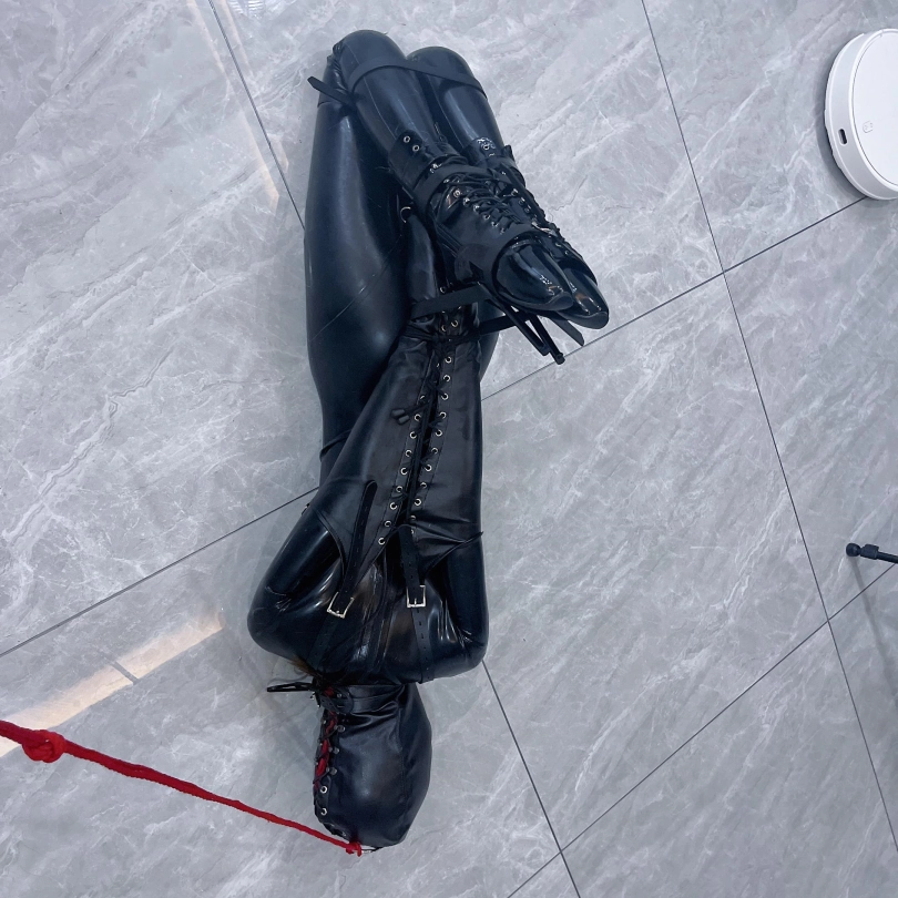 4.用拘束带链接单手套和高跟鞋的鞋跟,强制茶茶保持驷马状态。