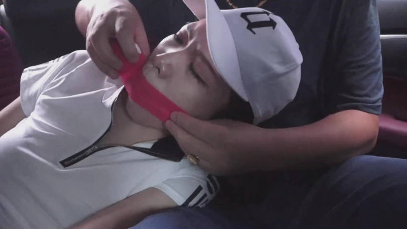 女孩害怕的 张开了嘴,一个 红色的 球塞进了女孩的嘴里。