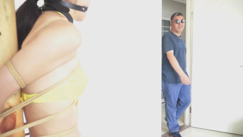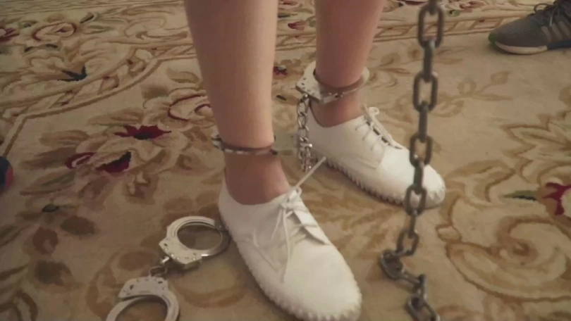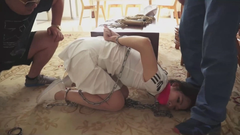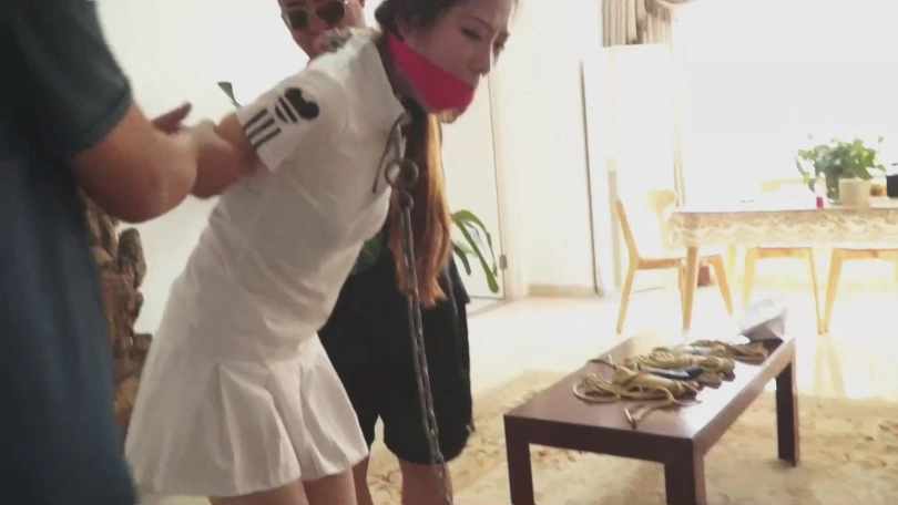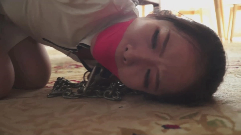 一个塞着嘴巴的女孩(依然饰)被五花大绑。撅着屁股跪在床上,双腿无法并拢,原来两脚踝被 一根金属棍