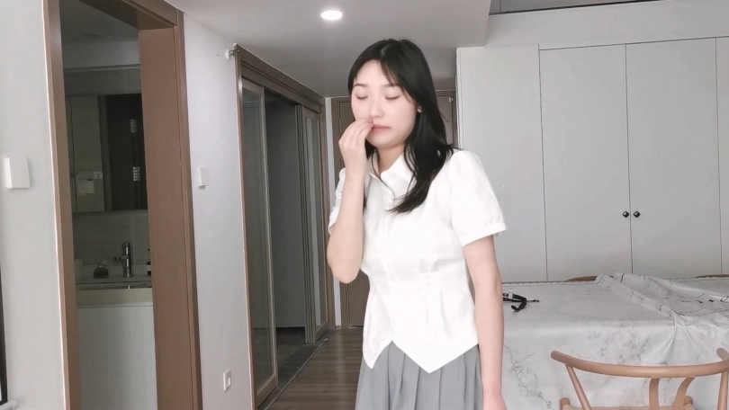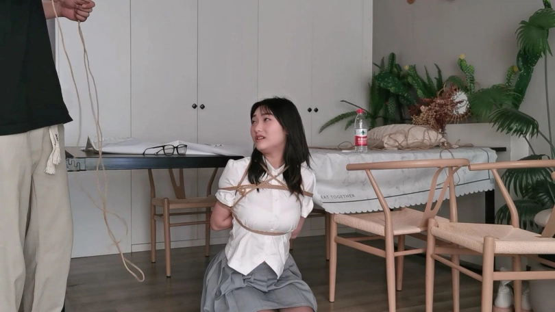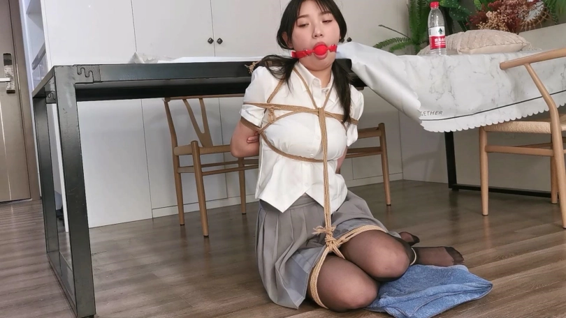 丰满的大熊妹子尤涵,尤涵穿着一身JK制服身材非常凹凸有致,这次把尤涵上身日式紧缚,双腿并拢跪起来,后边用绳子吊起来拴在桌子边上,就这么一个人静静的放置。