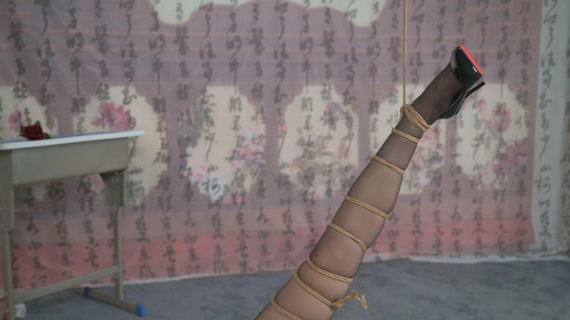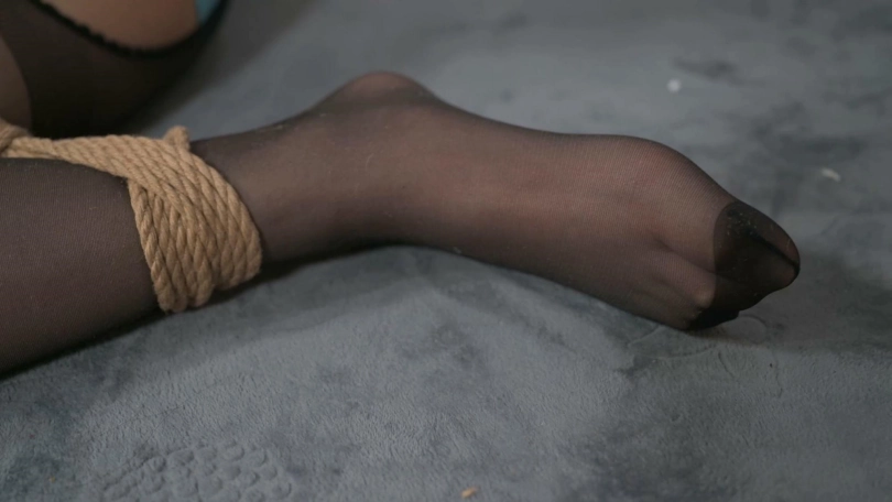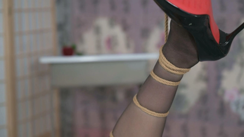 妹子穿内衣黑丝和高跟,上身日式缚,单腿多道紧缚并吊起,黑丝加高跟的美腿显得格外修长,绳师在她多个部位进行TK和电击。
