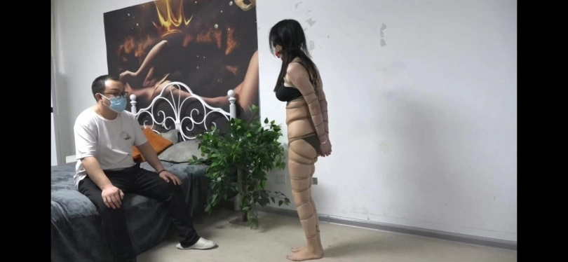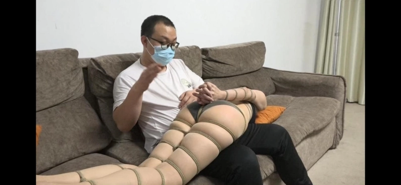 男子在将女王吊起来折磨了一会后,接着继续将女王直臂捆绑起来,双腿也被紧紧的捆绑在一起,也许是男子玩累了,于是让女王一个人在客厅内跳着玩,最后将她驷马捆绑起来~