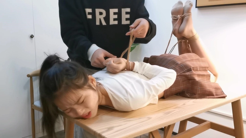 小郭长得非常像现在的演员张婧仪,就像是一个模子里刻出来的一样。小郭的柔韧性是很不错的,这次就用最紧的后手观音驷马加超长时间放置来考验她,结果小郭最后绑的崩溃了,戴着口球只能呜呜的哭,最后解开一下就大哭起来了,彻底给绑出心理阴影来了。