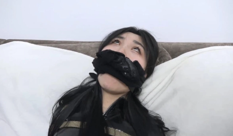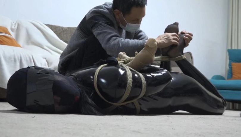 醒来发现自己被换上紧身衣躺在沙发上,要逃跑时被男主人发现抓住捆绑,捆绑过程中又反复被臭丝袜捂口鼻迷晕;