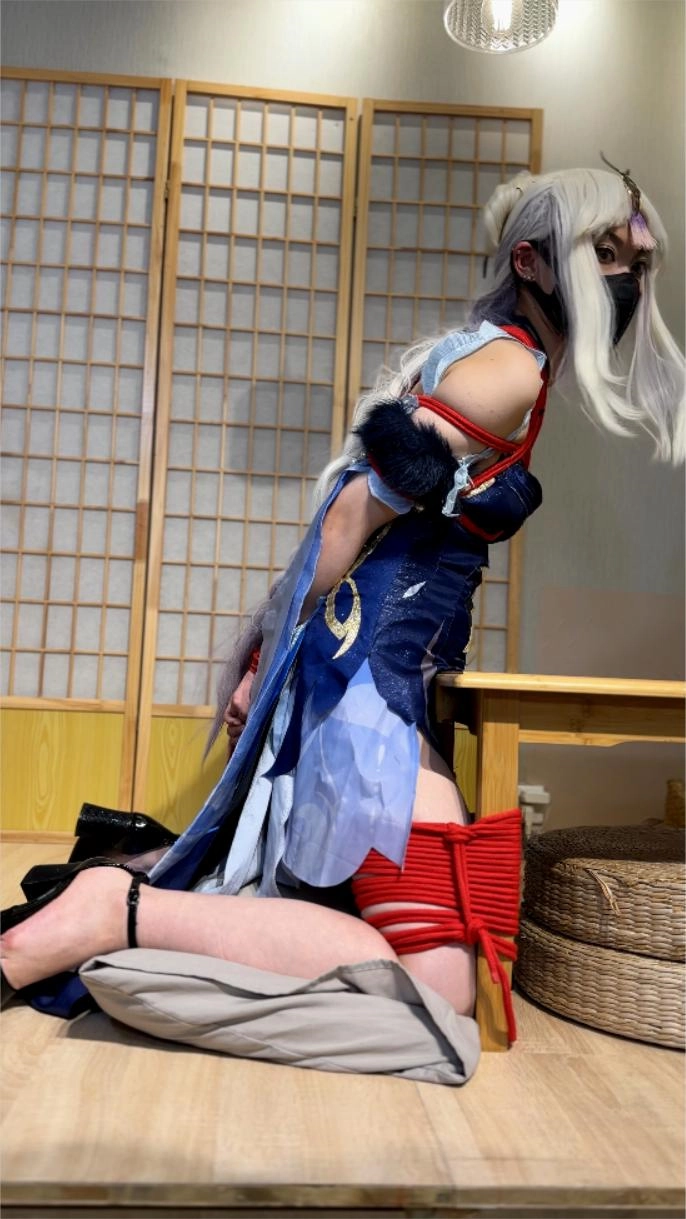 模特泽楼cos凝光进行拘束,胸缚后手缚,然后开腿绑在桌子上打皮鼓,泽楼因为试镜有点放不开,皮鼓打红了都不吭一声,包含束缚过程和放置双视角