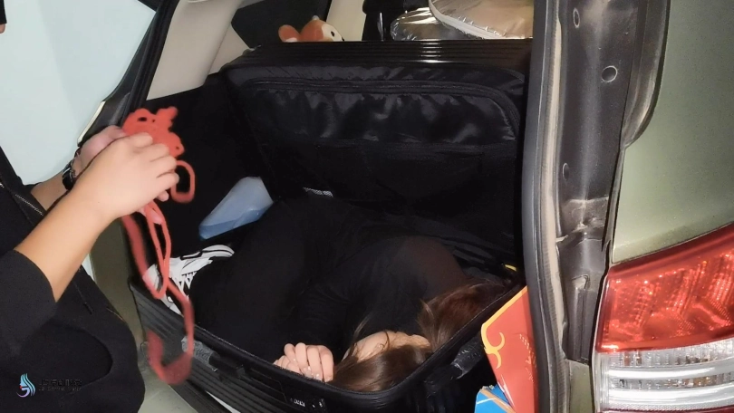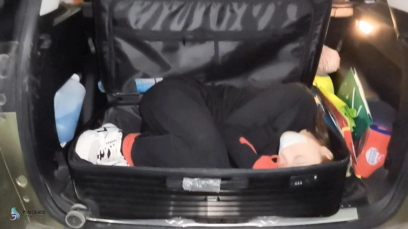 女孩的车被男人动了手脚,当女孩来到车上无法启动车时,男人装成路过的好心人,帮助女孩修理车子。就在女孩转过身后,男人从后面用喷过药的毛巾捂晕了女孩,并拿来行李箱,将女孩放进去。并困住女孩的手脚,嘴巴封着胶带。然后男人开车拉着女孩离去。