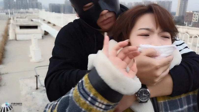 女孩在天台散步,被男人袭击弄晕。将其捆绑堵嘴,放置在天台。
