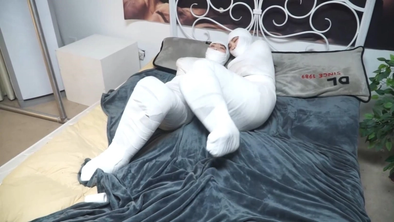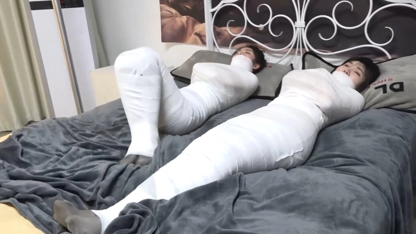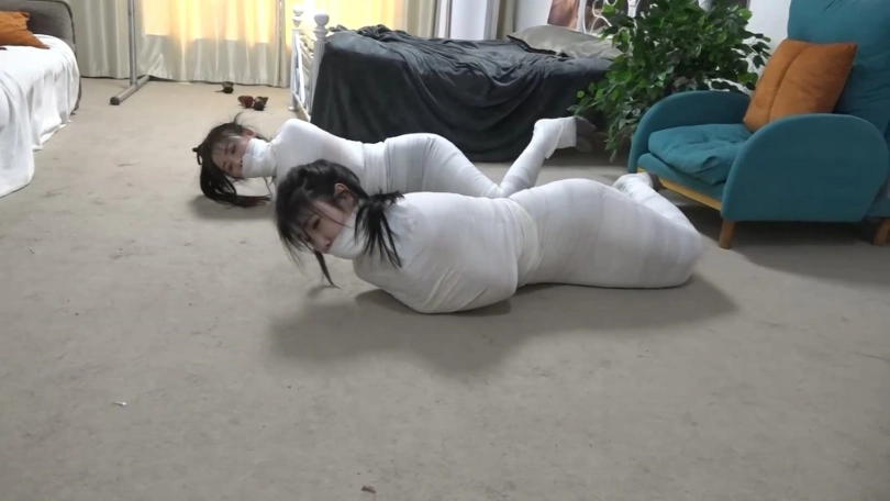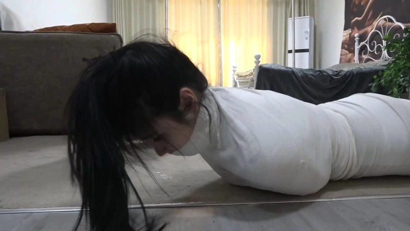 美女们彻底被洁白的绷带包裹成只露脸的木乃伊人茧,美女们只能奋力挣扎蠕动,想办法在地上爬行逃跑,但是被狱警发现,美女们连唯一的丝袜脚也被包裹,包裹的只露出可怜兮兮的眼睛。美女们彻底变成的洁白的人茧~