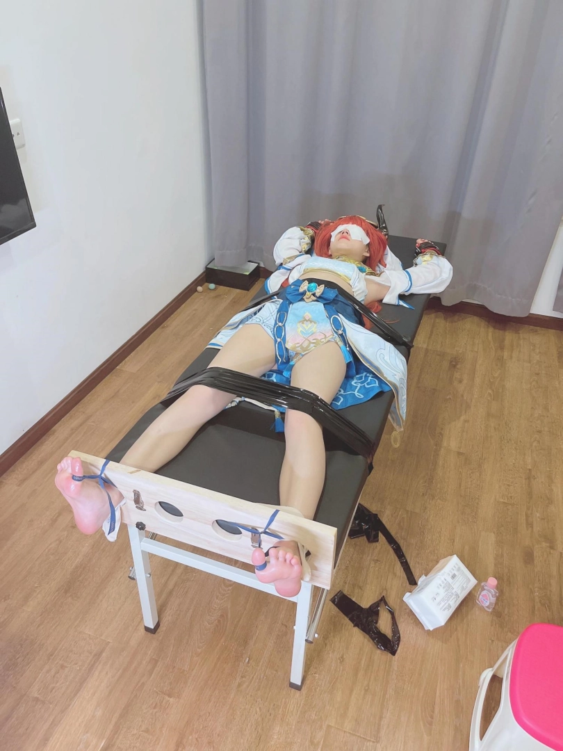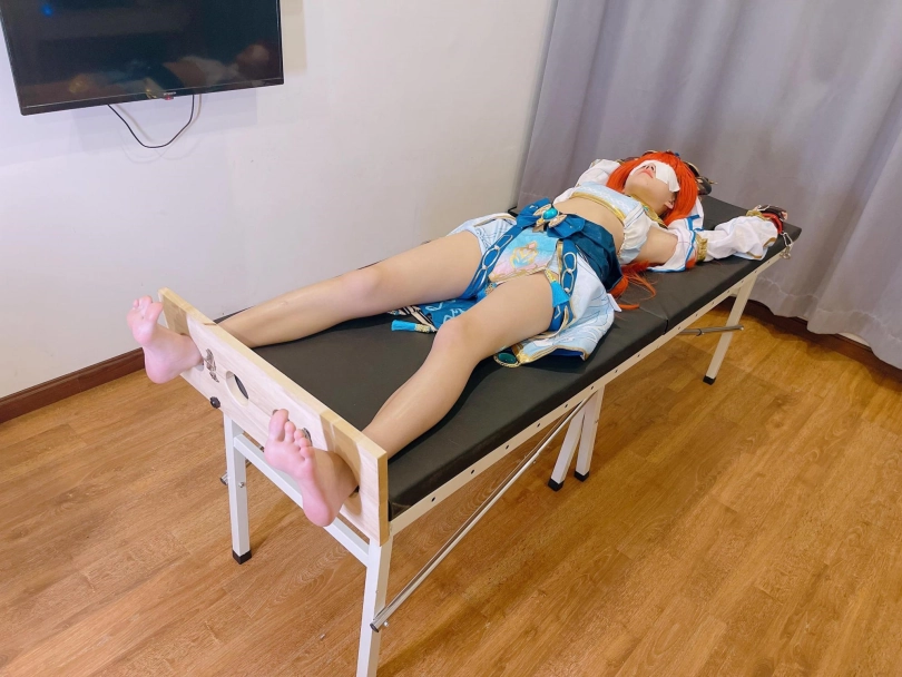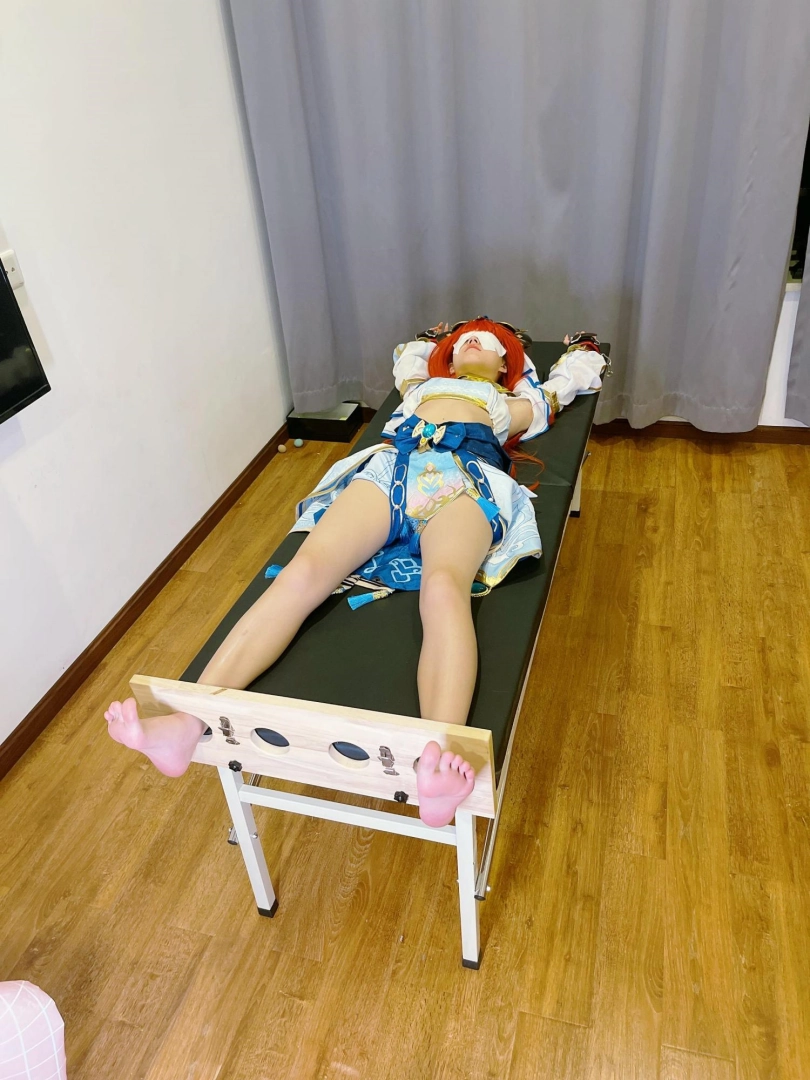 妮露恢复意识时,身体已经被牢牢地绑在痒刑床上了。