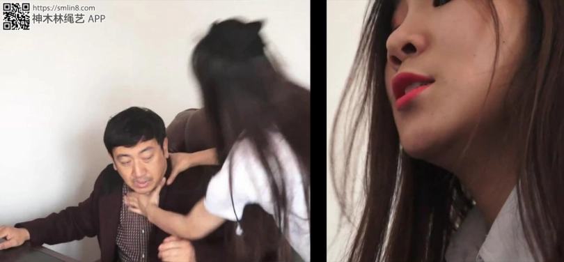 绝望的女警只好先想办法解开拘束,她发现边上的家具,于是又费力的蠕动到家具边上,用家具摩擦绳子。