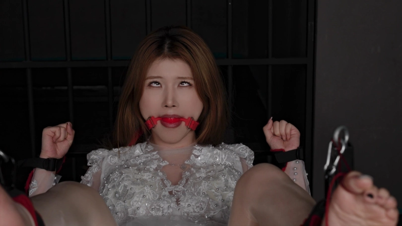 剧情故事:今天是飞熊先生和乐乐女士的婚礼现场,小玥穿上了纯白的婚纱,果真结婚的女人最美。可是她不知道的是,迎接她的竟然是丈夫奇怪的癖好。他和他的伴郎团把她绑在刑椅上用各种道具挠她痒痒。最后给她带上了口球,还用鞭子抽她脚底,极度反差。
