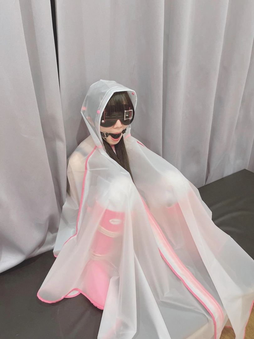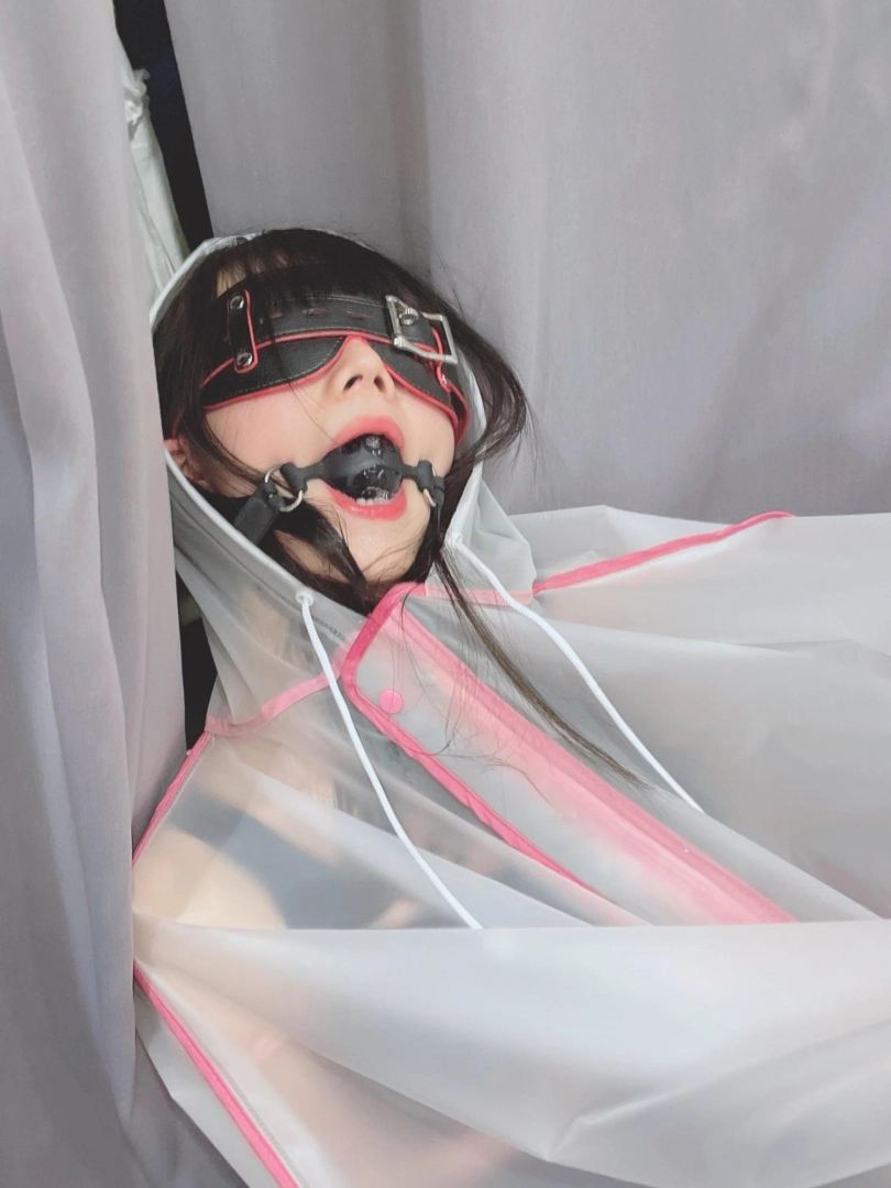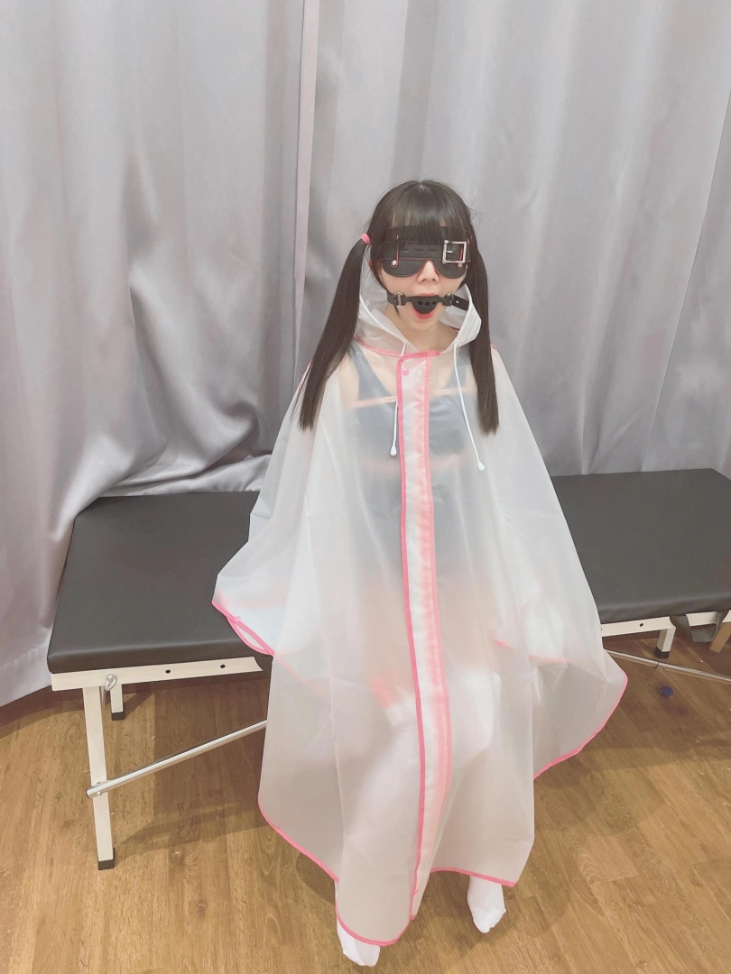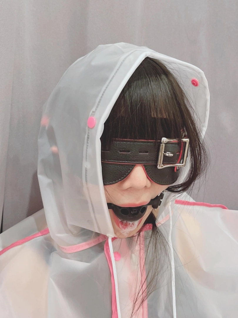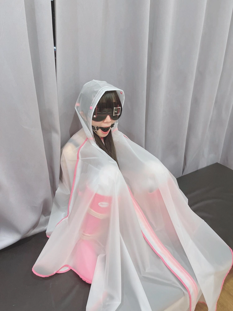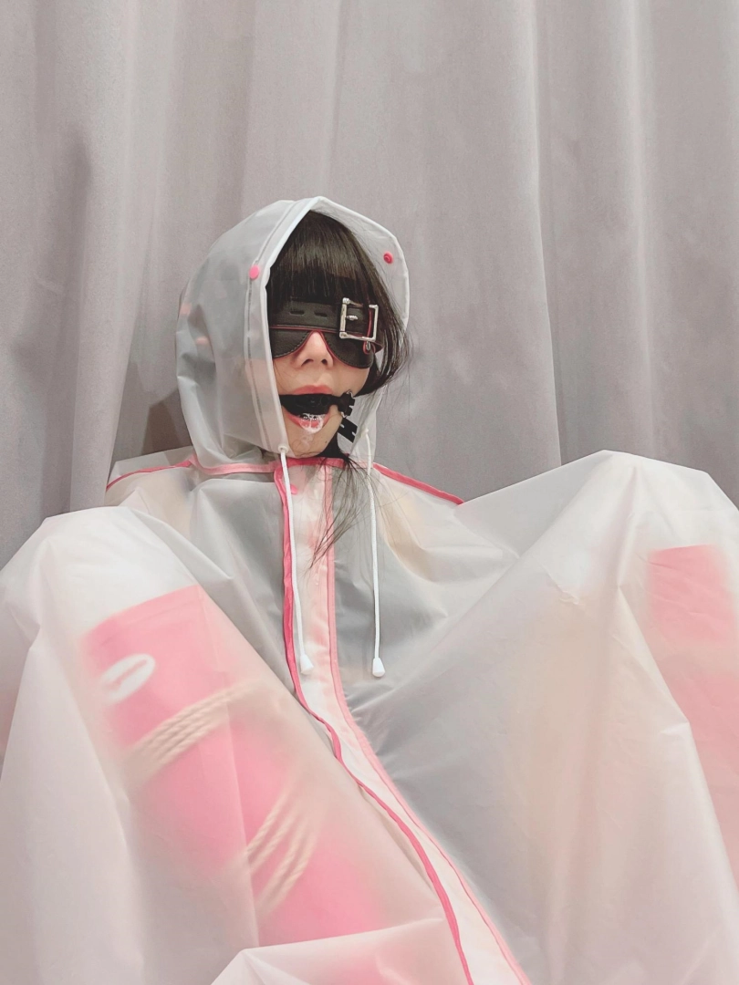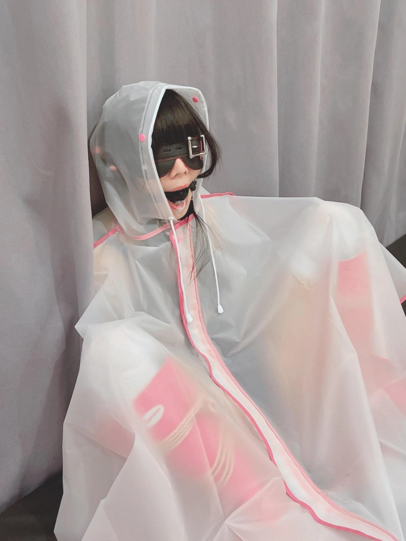 可爱的茶茶被绑成一个任人抚弄的M腿姿势,戴着眼罩口球,唯一能遮挡她羞耻姿势的只有一件半透明的雨衣,身上的绳子和白丝死库水在雨衣下若隐若现~