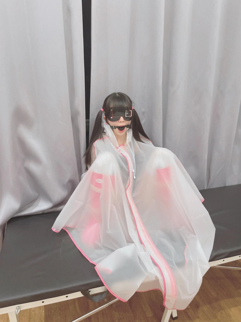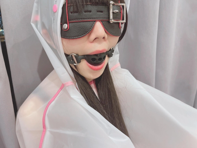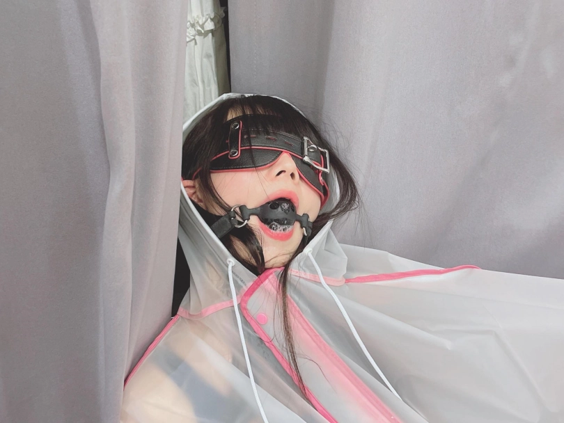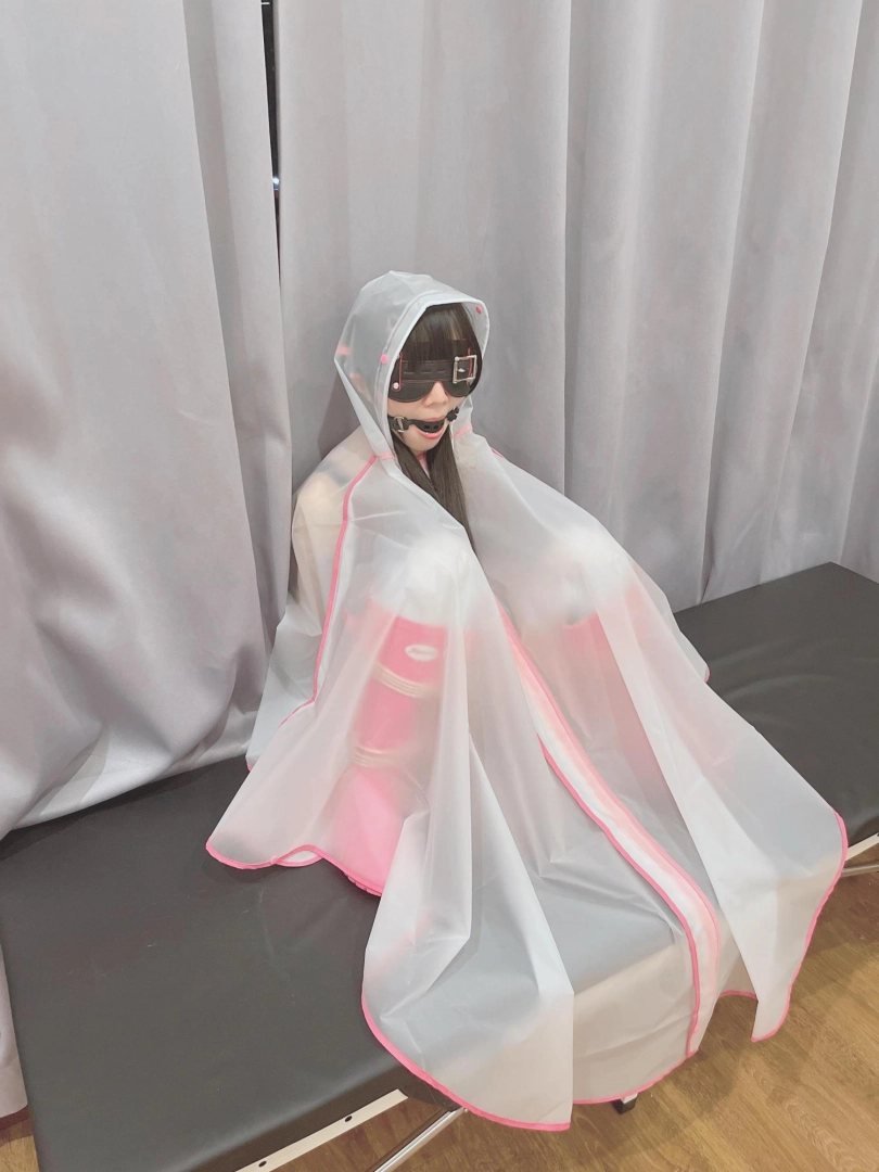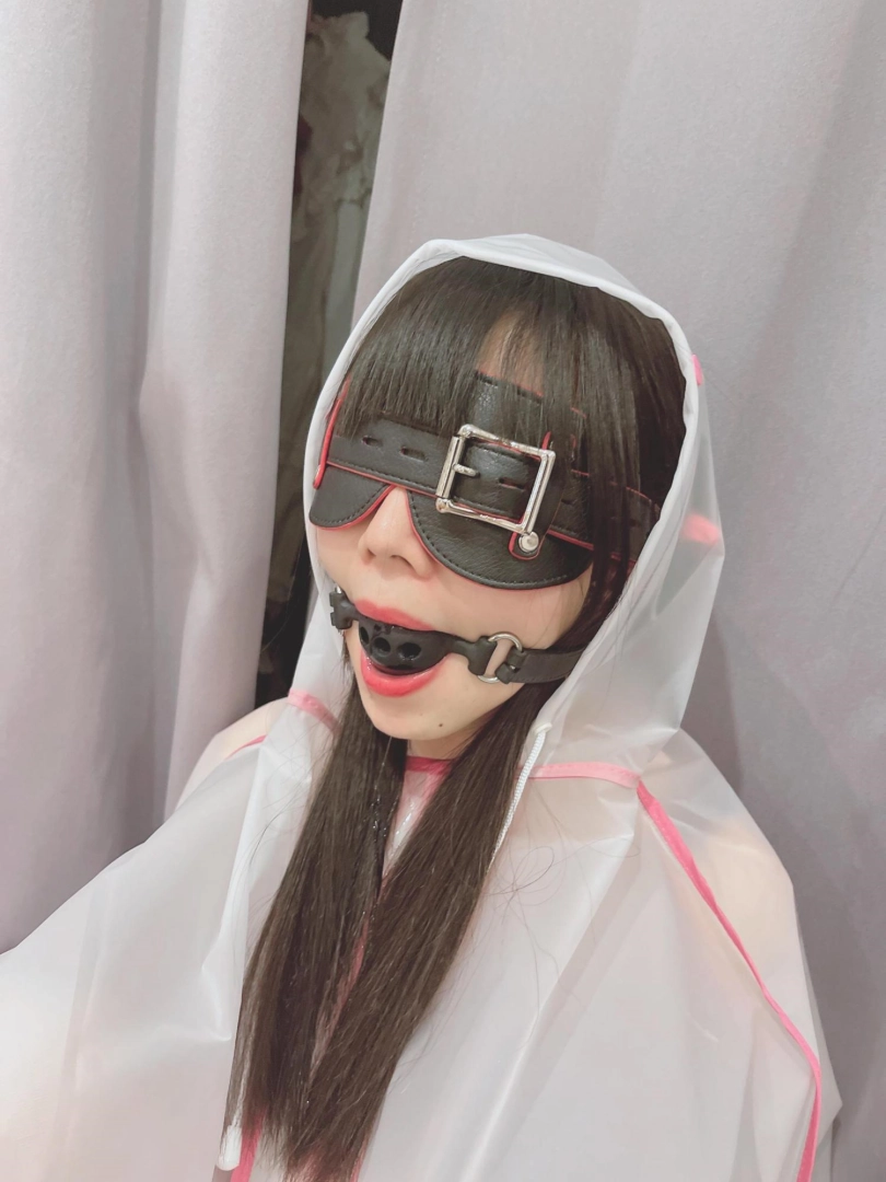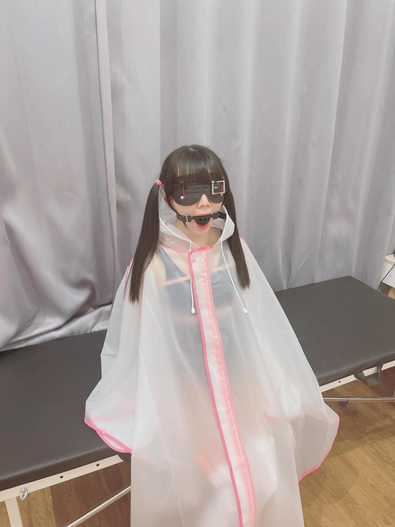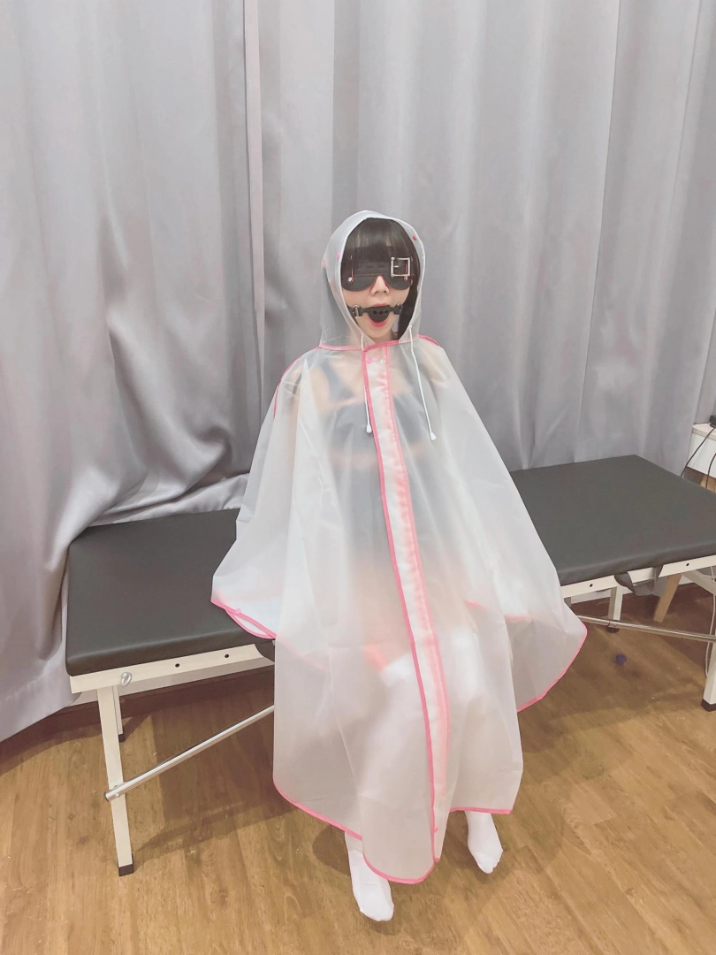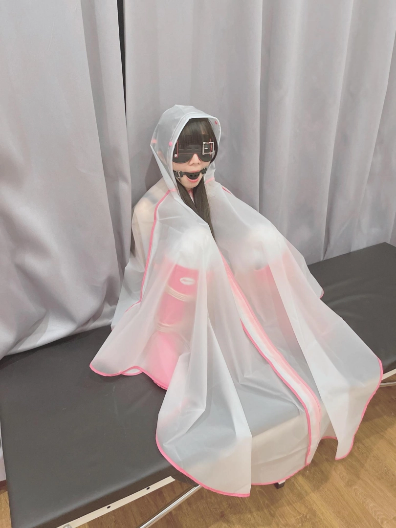 可爱的茶茶被绑成一个任人抚弄的M腿姿势,戴着眼罩口球,唯一能遮挡她羞耻姿势的只有一件半透明的雨衣,身上的绳子和白丝死库水在雨衣下若隐若现~