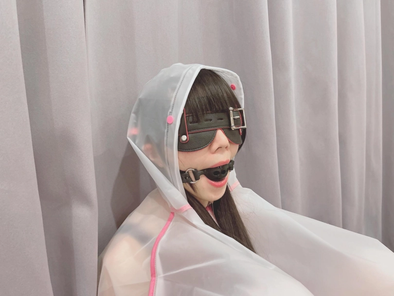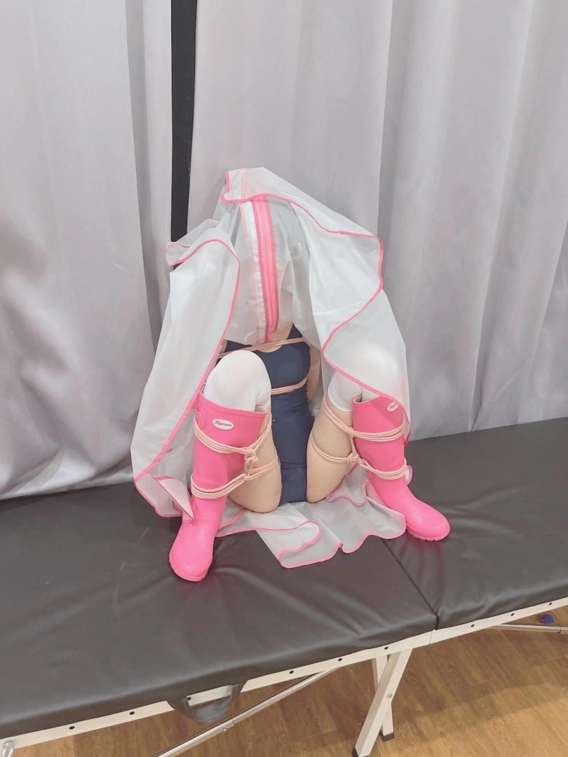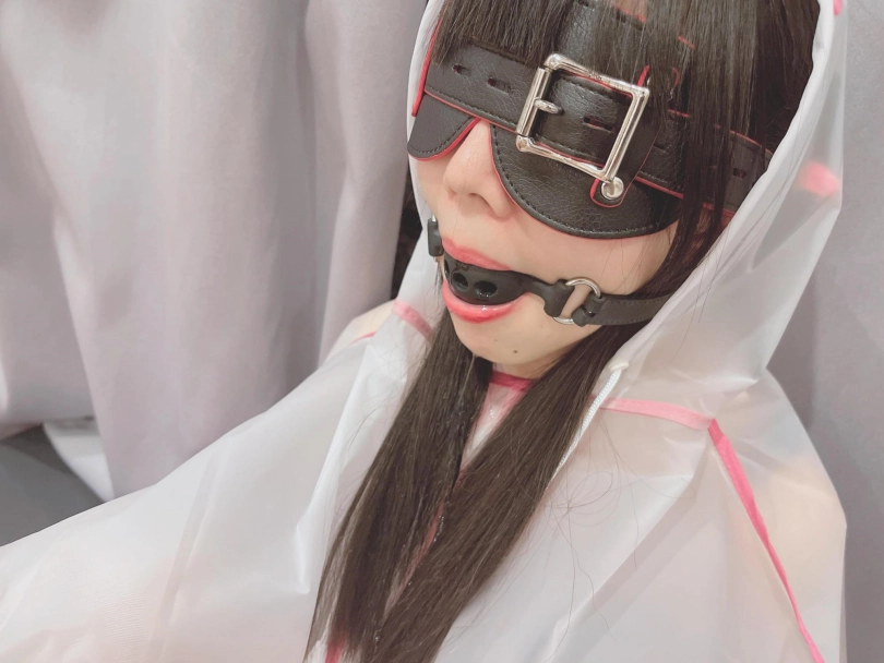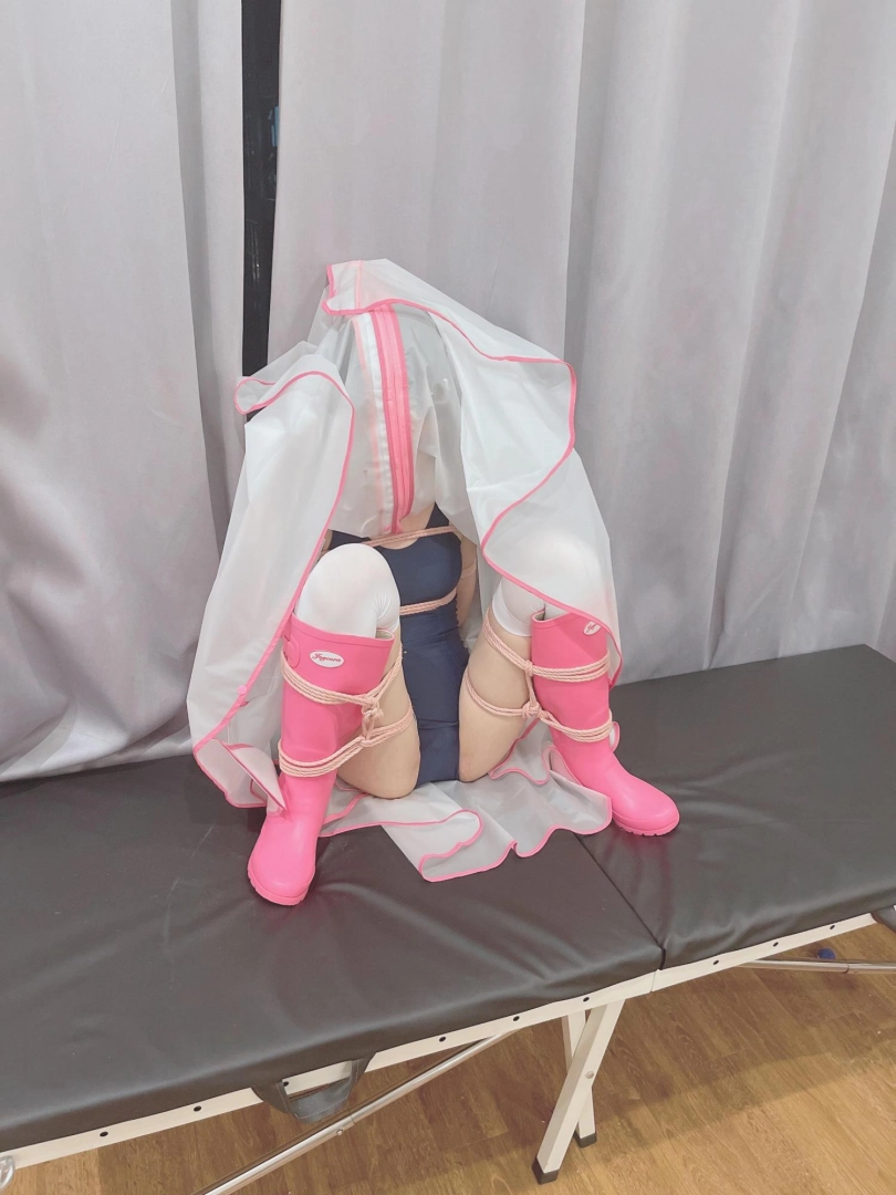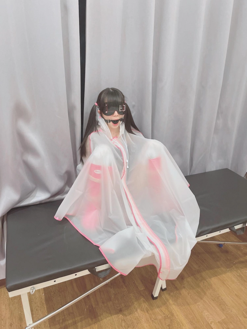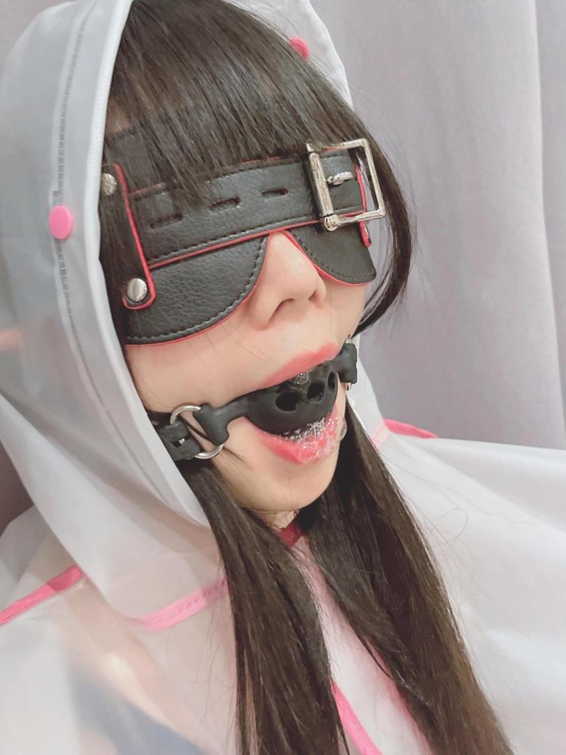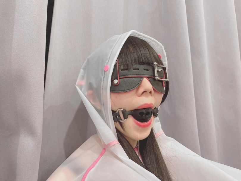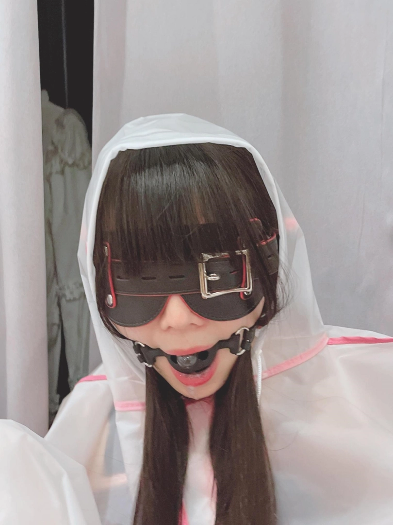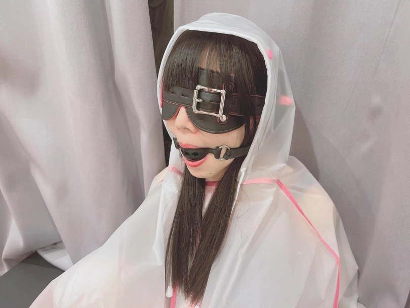可爱的茶茶被绑成一个任人抚弄的M腿姿势,戴着眼罩口球,唯一能遮挡她羞耻姿势的只有一件半透明的雨衣,身上的绳子和白丝死库水在雨衣下若隐若现~