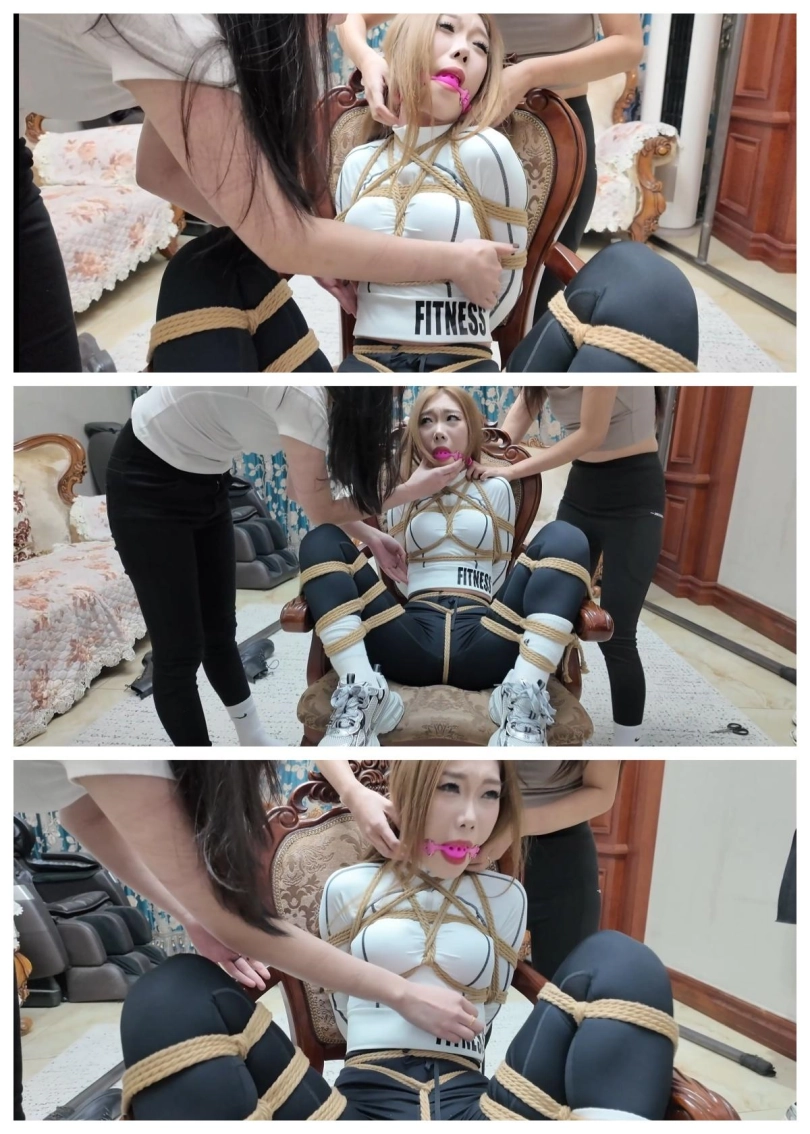 可是常人解不开的绳子,女保镖未必不可以,挣扎了许久,二女保镖解开了身上的束缚,柠琪第一时间掏出了嘴里的厚毛巾(此处给了特写,厚厚的毛巾塞满了美女的口腔,堵嘴党看了直呼爽。)掏出毛巾后,又帮忙雨诺撕开胶带,撕开牢固的胶带的雨诺疼得呜呜叫,好不容易撕开了胶带,但雨诺的堵嘴物将她的舌头压住,让她无法自己吐出嘴里的棉袜,露出一副生无可恋的表情!柠琪也是废了好大的劲才从雨诺嘴里掏出了堵嘴棉袜。重获自由的二人,商量着对芷溪进行报复,于是拿着绳子去往房间,将在游戏里激战正酣的芷溪摁在桌子上,结结实实捆绑起来,芷溪一直破口大骂,可一人面对两个女保镖显得无济于事,芷溪被两个美女保镖三下五除二的捆绑起来并押往客厅,在客厅里芷溪上半身被五花大绑,下半身被蟹缚捆绑在椅子上,看着动态不得的芷溪,二女以其人之道还治其人之身,柠琪用紫色口球堵住了芷溪的嘴巴,然后雨诺拿着手机,柠琪站在芷溪身边,像胜利者与她的俘虏拍照,嘴边还不忘嘲讽芷溪说到:哟,这不是大小姐嘛?怎么被捆绑成像个老母猪一样了?等羞辱性话语!拍照完,嘲讽完,二女觉得还不够,拿出了电动牙刷,电动铁丝,小齿轮,细硬梳子,针对芷溪的脖子,腰等痒痒部位猛攻,芷溪痛苦地发出呜呜呜呜的声音。挠着芷溪的上半身,二女一低头发现芷溪扭动的双脚,灵机一动,一拍即合,把芷溪的鞋子拔下来,然后用工具对着她的双脚猛攻,岂不是让芷溪更爽嘛?就这样干!二人蹲下来,解开了芷溪的鞋带,然后将她的鞋子慢慢的脱了下来,露出两只大白棉袜脚扭动着!雨诺和柠琪一人只白袜脚,用电动牙刷,电动铁丝,小齿轮加梳子对着芷溪挠了起来,怕痒的芷溪挣扎着并发出呜呜呜呜的声音!玩弄了芷溪,一会,雨诺的手机响了,雨诺前去查看消息,消息显示:坏蛋的巢穴已锁定,命你二人前往侦查!看到消息的雨诺与柠琪商量,决定由雨诺先前往侦查,柠琪留下来保护芷溪安全,商量决定后,雨诺离开,此时就剩下了柠琪和芷溪!这下可把柠琪高兴坏了,本来就想好好折磨芷溪的,出口恶气,正好逮到机会!柠琪拿来一块柠檬,塞入芷溪嘴巴里,然后又用粉色带孔口球结实堵上芷溪的嘴巴,让口水可以从口球孔里流出来,随后又用紫色耳塞塞住芷溪的耳朵,接着用黑色绷带缠绕封住了芷溪眼睛,随后用白布蒙上了芷溪眼睛!一下子,芷溪就被捆绑堵嘴塞耳蒙眼,彻彻底底的沦为柠琪的女俘虏!接着柠琪又对芷溪挠了脚心,被感官封闭的芷溪对痒痒更敏感了,呜呜呜呜的叫着。玩了一会,柠琪也累了,检查了芷溪身上的绑绳及堵嘴蒙眼塞耳朵都结实后,去房间睡觉了,留芷溪在客厅挣扎并发出呜呜呜呜声音。
