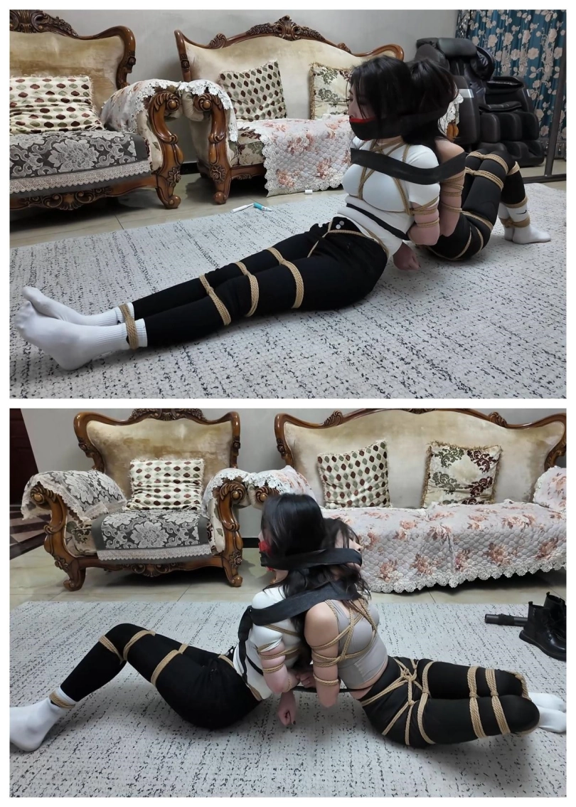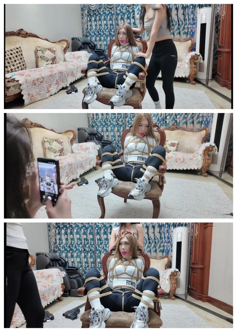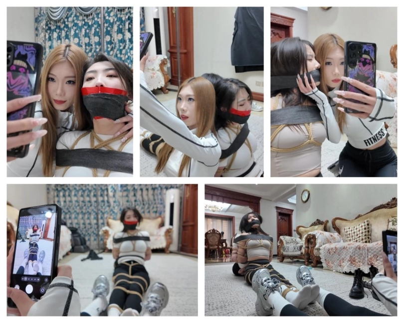 两位女保镖(雨诺和柠琪)已经被结结实实的捆绑在一起,芷溪用黑色绷带缠绕住二人嘴巴,这样即可以防止女人叫喊也可以固定二女保镖头部,让他们的挣扎幅度变小,在二人的肚子处也用黑色绷带缠绕捆绑,近一步加固了对二女保镖的束缚。在麻绳,黑色绷带的双重束缚下,雨诺和柠琪只能轻微地扭动身子并发出呜呜呜呜的抗议声。当然,芷溪可不管这二美女被捆绑得是否难受,也不管这二美女被塞满的嘴巴又多痛苦,只管自己玩乐。芷溪拿出手机。和被捆绑结实的雨诺,柠琪自拍起来,像胜利者和属于她的两个战利品的自拍!自拍了多个姿势后,芷溪稍显疲惫,检查了雨诺和柠琪身上的绳索是否松动,检查了二美女的堵嘴物是否还塞满口腔后,都确认捆绑,堵嘴,封住都结实后,芷溪离开前去房间休息!芷溪离开后,二美女在地上努力扭动身子,挣扎着,试图解开身上的束缚,可是她们除了扭动身子和发出呜呜呜呜的声音还能做什么呢?解开麻绳加黑色绷带可没那么容易!
