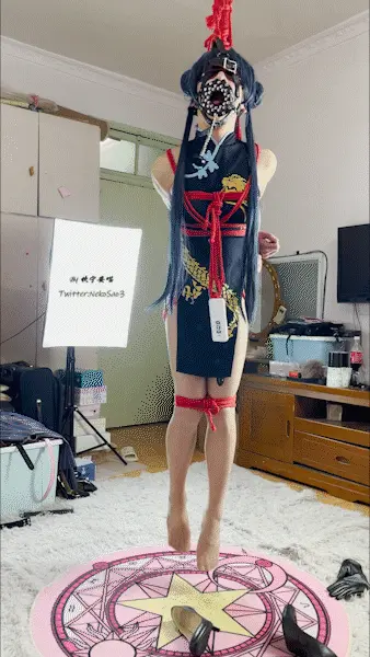 服装是最近比较火的碧蓝档案中华风旗袍萝莉妃咲,只能说这个角色完全长在我的XP上了~后手直臂+上半身悬吊+眼罩蒙眼+马具口枷强制开口+训练器强高,手和马具口枷相连,强迫抬头~