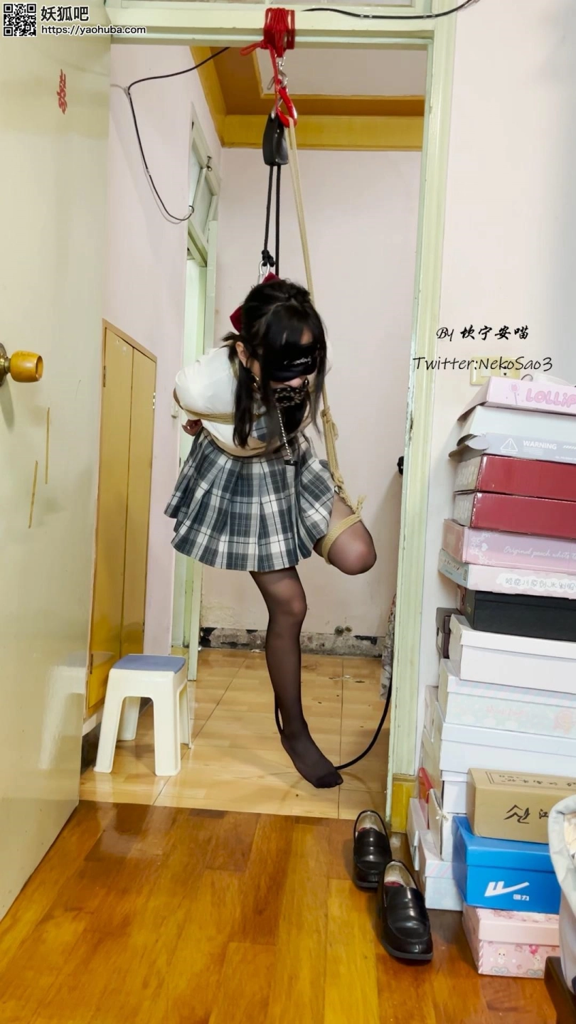 这次是单脚吊缚,另一条腿折腿缚的同时也吊起,增加束缚感的同时也能够分散吊绳的作用力