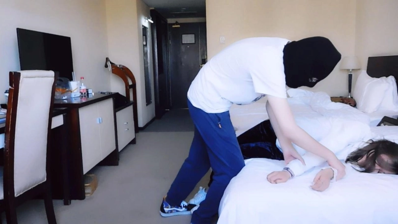 妹子来到酒吧喝酒,然而酒吧老板是个人贩子,偷偷给她的酒里下了药。妹子过了一会,就感觉不对,然后就晕过去了。这时老板觉得新弄的药还挺管用,有妹子可以玩了。老板把她驷马锁在床上,等她醒来。妹子醒来,发现自己被锁住了,十分惊慌。老板出现了,开始调戏妹子,脱下鞋袜,锁上脚趾、脚心、拇指。妹子更加惊慌,不断求饶。老板来解开镣铐,脱下了她的衣服,只剩内衣,检查身体无误后,再全部锁上,更是一顿调戏,然后离开。留下妹子挣扎,等待明天的拐卖。