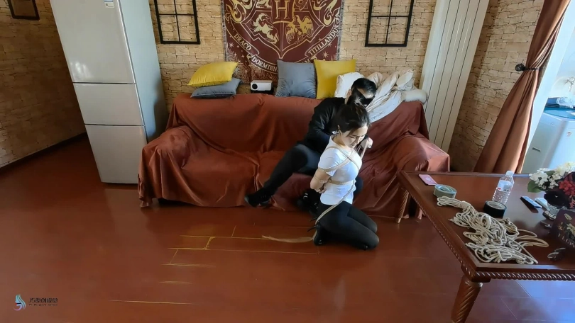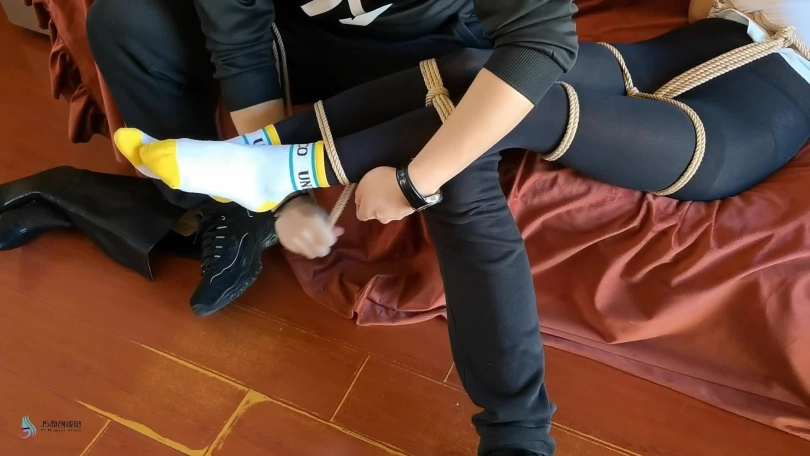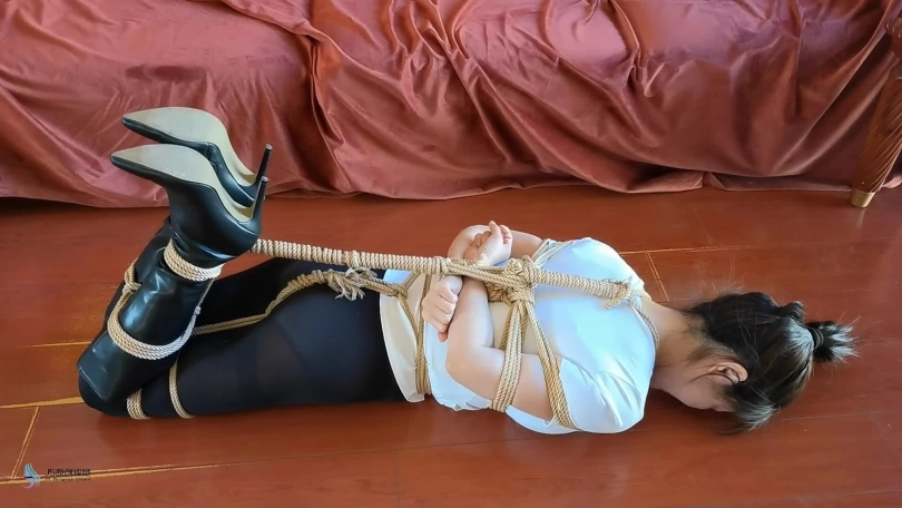 主演嘉莉,美女老师想要提高坏同学成绩,主动提出要去家里给他补课,不曾想,等待她的是一把刀,几根绳子,各种胶带。坏同学又从背后踢她膝盖让她跪下,然后用绳子捆绑她(上半身直臂缚拍下捆绑过程。)捆好上半身后,然后捆绑她双脚(捆脚腕,小腿根,膝盖,大腿根,股绳。)捆绑完手脚后,又用绳子把手脚连起来绑成驷马倒攒蹄。坏同学看着捆得像粽子的老师,得意的摸老师的大腿,屁股再把她身子侧过来,摸肚子和胸。老师说:你这是犯罪快放开我。坏同学说:看来得堵住你的嘴了。然后拿来一块毛巾,揉成团,捏住老师脸颊逼她张开嘴后,塞了进去。然后用橙色胶带缠绕封上。(嘴巴尽量塞满)堵完嘴后,坏同学拍了拍又摸了摸她的屁股后说:我去上个厕所,回来再玩玩你。然后离开,老师在地上使劲挣扎,并扭动着身子往门口爬去。(镜头拍全身挣扎和面部表情)一会,坏同学回来发现想逃跑的老师,决定惩罚她。然后松开她脚上的绳子,脱了她的靴子(拍脱靴子过程),再继续绑上(和上面一样,也是驷马。)然后用力的挠脚心,挠腰,脖子,脸等,全身TK。折磨玩弄一会后,坏同学把老师长发绑起来再和身子连起来让她强制抬头。然后撕开嘴上的胶带,掏出毛巾,然后白袜子堵她的嘴巴,外面用肉色绷带缠绕几圈,再用橙色胶带封上,堵得严严实实的。然后离开,留美女老师在地上挣扎并发出呜呜呜声音(全片多挣扎,多发出呜呜呜声音)