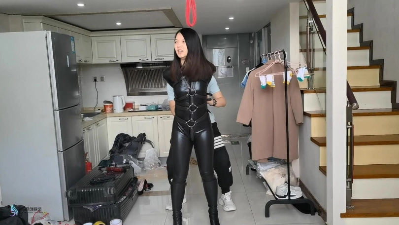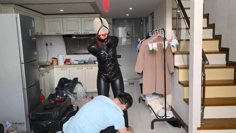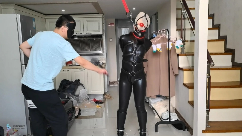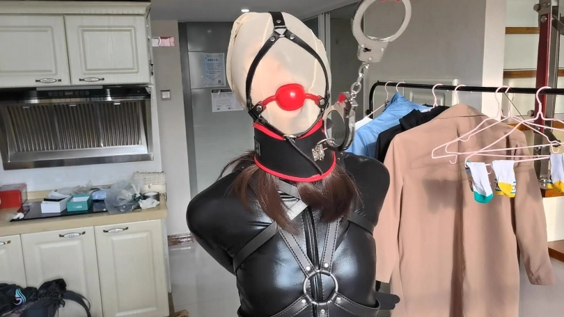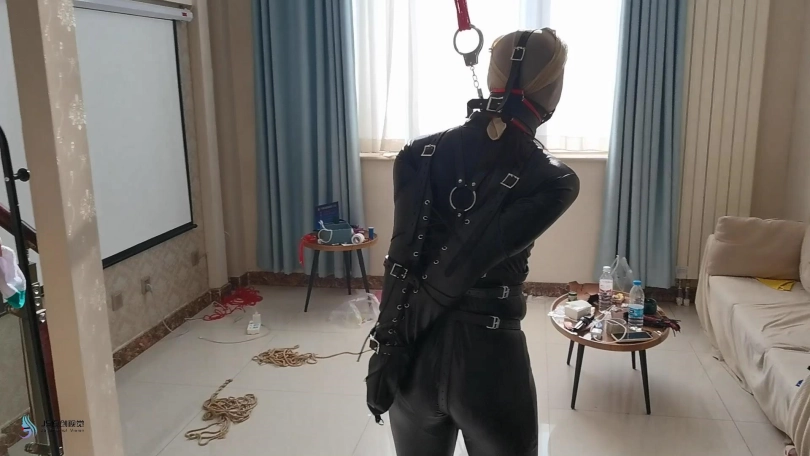 人贩将诗彤的束缚解开。用皮质拘束带束缚她的身体,用单手套将她的双臂束缚住。她的头上被套上一条肉色连裤袜。嘴巴被马具型口球塞着。鼻子被戴上固定脖套,这让她无法低下头。她的脚被脚铐铐住。人贩不断的用皮鞭抽打着她的身体。。。