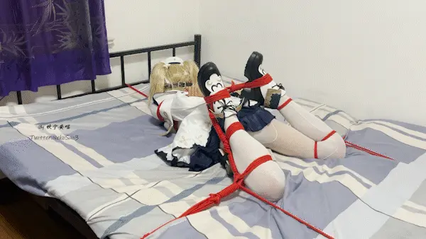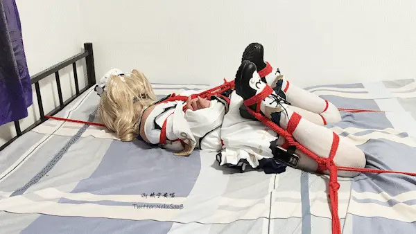 这是一期放置,但是床上驷马固定!角色是芭芭拉,上身日式,双腿折腿驷马但是捆法略有差异,然后将双腿分别拉向两个床脚,同时脖子戴上项圈、拉向床头,从三个方向拉紧,完全消除动弹的可能。然后戴上眼罩、装上训练器、在双脚脚底和大腿根部贴上郊狼贴片,关上房门,只留下芭芭拉独自在床上做着毫无意义的挣扎……