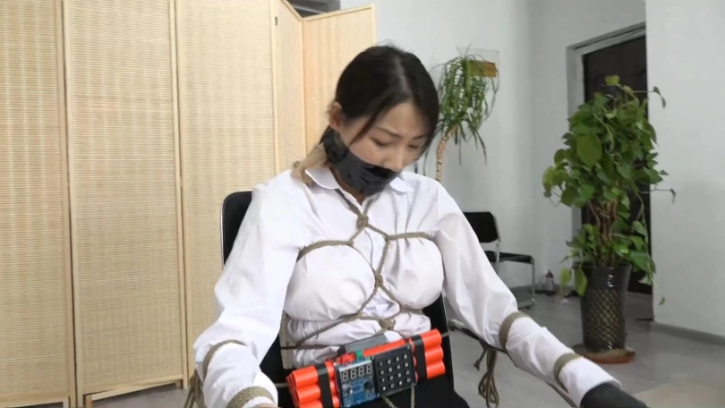 男人递过一张纸条,上面写着拆弹游戏,待会你搭档会过来救你,如果他解开你身上的任何东西,都会引发炸弹爆炸,但是可以通过密码解开,密码在桌子的手机上,密码是AZ3T,全凭你们的配合了,男人到来,试图解开女人的束缚,女人激烈挣扎,拼命暗示桌子上的电脑或则手机男人来到电脑前,女人呜呜并点点头,密码:AZ3T1E,女人努力提醒,美女模糊不清的喊声密码,但是到E哪里太难发音了,模特呻吟很久都听不清,男人好不容易输入,一直和1混起来,男人随便输了个数字,女人激烈挣扎,男人担心炸弹爆炸,用胶布闷住女人鼻子,炸弹开始倒计时,男人离开,只留下女人在椅子上拼命挣扎,可怜的美女到底能不能逃出生天?