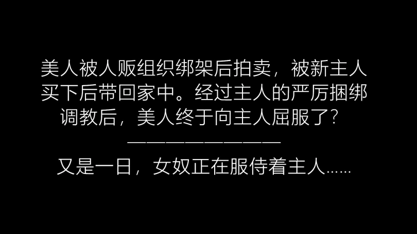 女奴假意逢迎请求主人把自己紧紧绑住,主人于是给女奴戴上了眼罩和口球,又用皮带紧缚住女奴的脚踝,双腿和身躯。主人欣赏着女奴,不时地爱抚,女奴配合地扭动娇呼。