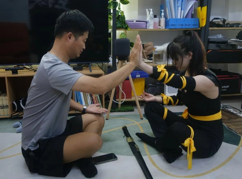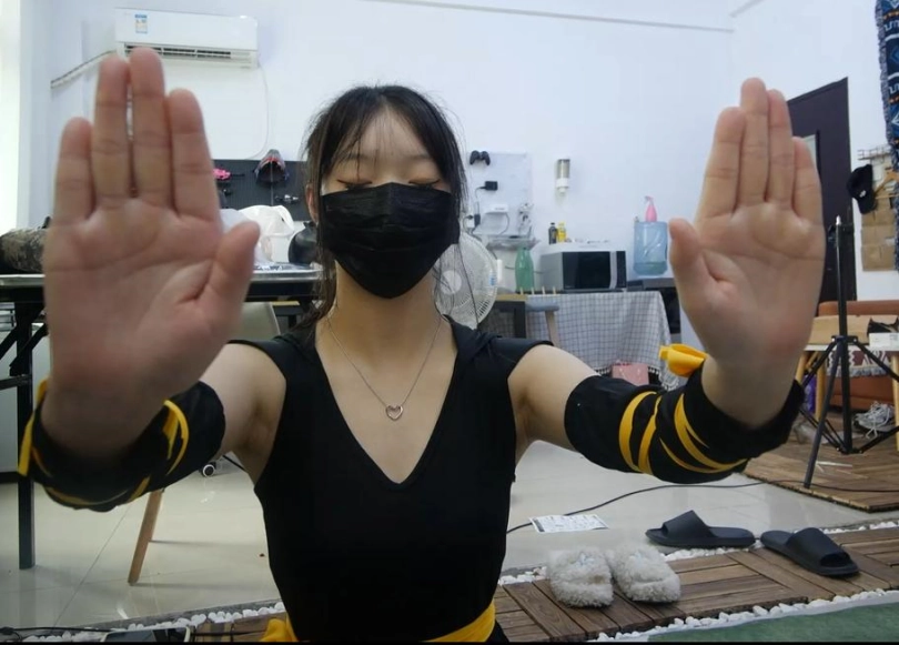 女主蒙面服突然出现,凭空出现在屋子里把男主吓了一跳,女主背对着男主左右看一脸疑惑。男主偷偷过去想拍女主一掌,女主转过身回击,然后迅速点住男主,让她不要害怕,男主被击了一掌身体很虚,解开男主后,女主点住他的胸口缓解疼痛后为他运功疗伤(两人盘腿坐下,掌对掌)。一会后,男主趁女主没注意点穴她(女主保持运功的姿势不能动),男主嘚瑟嘲讽女主几句。继续盘腿运了一会功,没想到女主冲开穴道,2人共同两掌相对一击,男主一只手用力一堆,女主面露痛苦色后那只被推的手回收然后翻转了一下手指成兰花指放在膝盖上,而男主的手那只手就掌心朝上放在膝盖上,给女主下特写(男主还在用力运功和女主对抗),几秒后女主膝盖上的手变为点穴定住男主,男主定住后:“卑鄙”。【男主现在定住的姿势为一手运功掌心面朝女主,一手掌心朝上放在脚上的膝盖上】给男主特写,女主此刻也可以调戏下男主,解开男主,男主手打向女主又被定住,女主再解开男主,男主活动后单脚跪在地上一手撑在地上,另一脚成直角手撑着膝盖又被定住,女主点了男主双手,男主想用手解她下半身的穴道,被女主把手拉走,男主挣脱后解开自己腰间,能动后刚微站起一点又被女主点住按回去,女主再解开他手上的穴道,男主解开自己腰间的穴道。让女主过来说个秘密给她,女主跪下来,男主出手定住她。再多点了她腿部和后背的穴道防止她迅速冲开穴道。
