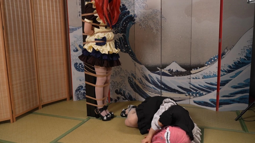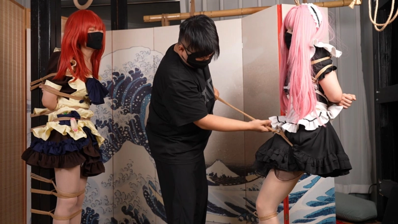 第一部分是喜多被绑在柱子上,波奇酱想来解救她结果自己反而被吊缚起来。然后两个人一起被带上玩具折磨。